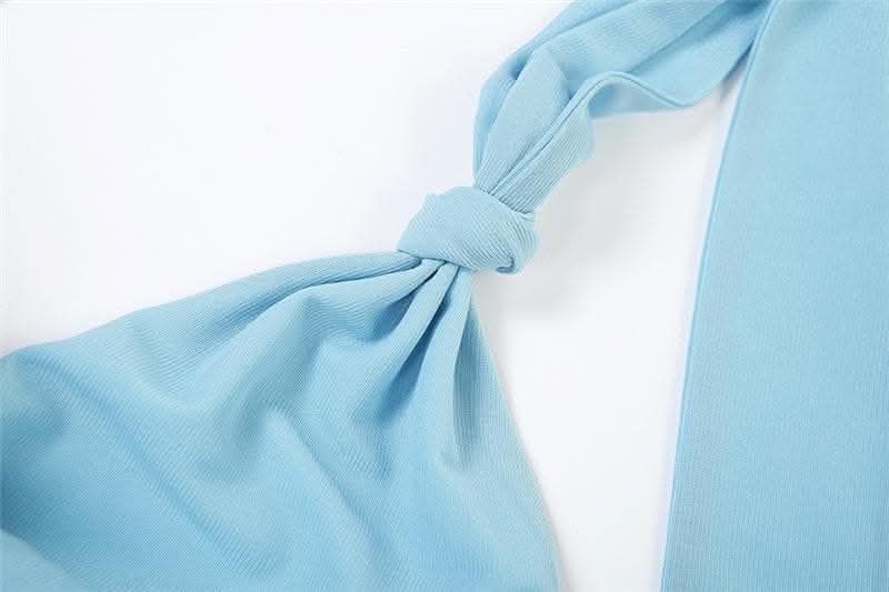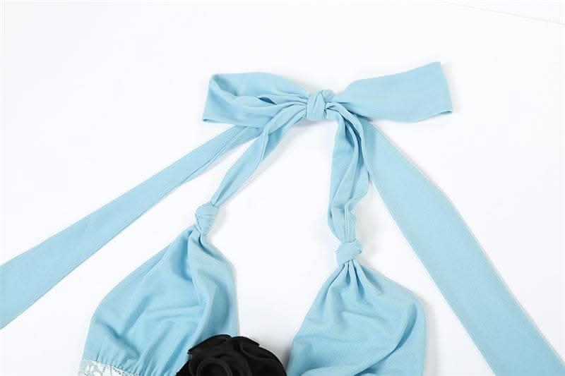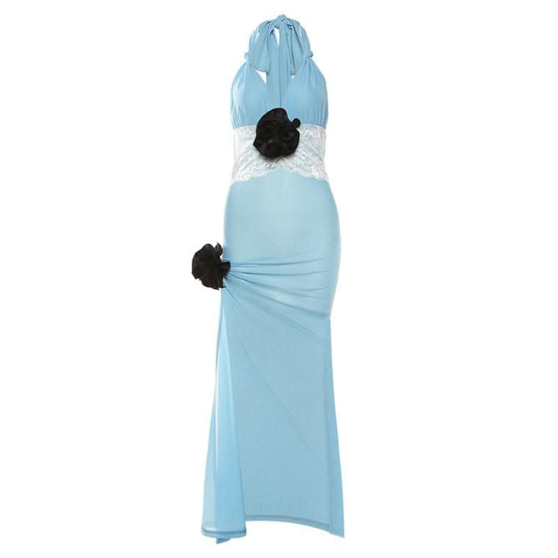 Flower applique contrast v neck lace hem halter backless maxi dress-final-sale