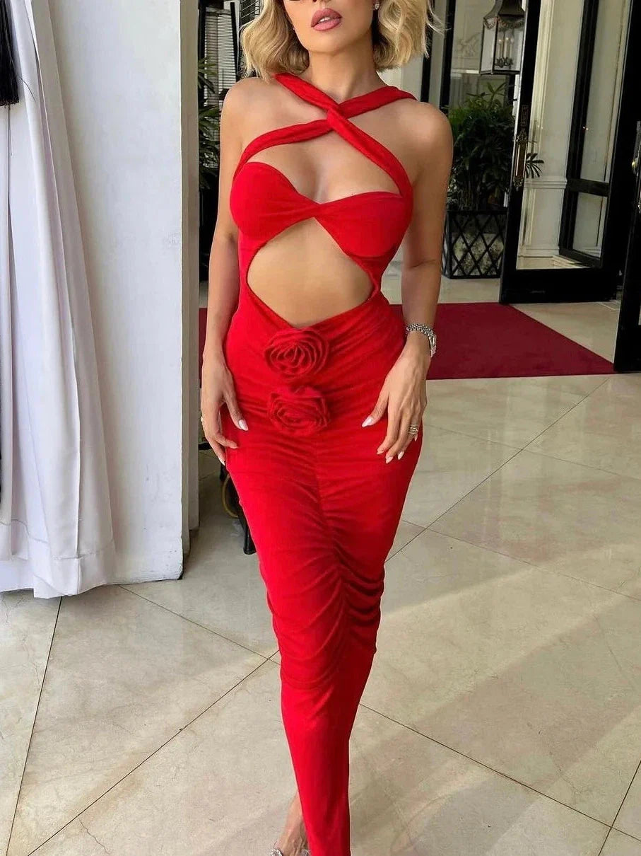 Flower Applique Halterneck Cutout Ruched Midi Dress