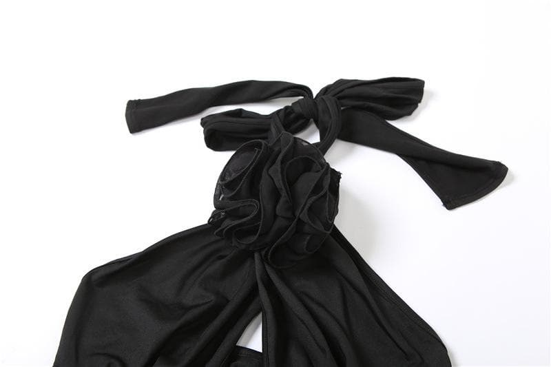 Flower applique hollow out solid backless halter crop cut out top