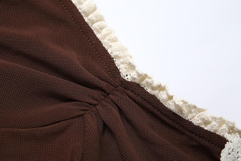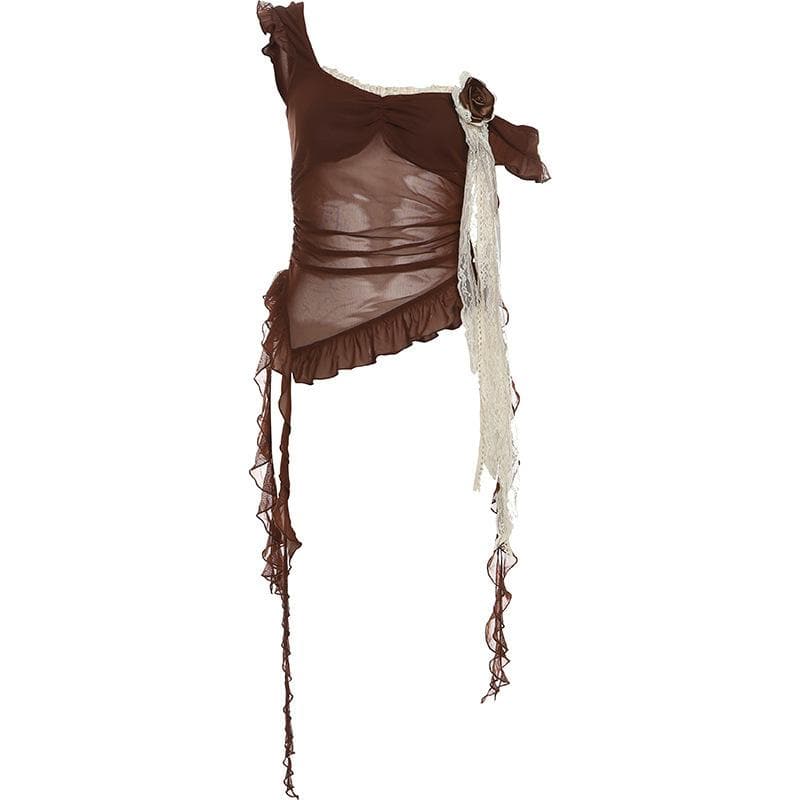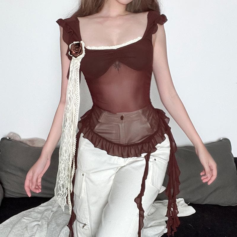 Flower applique lace hem mesh irregular cami top