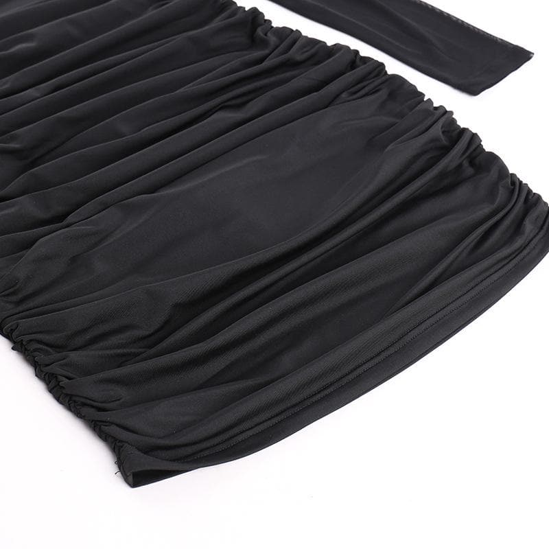 Flower applique mesh ruched off shoulder long sleeve mini dress