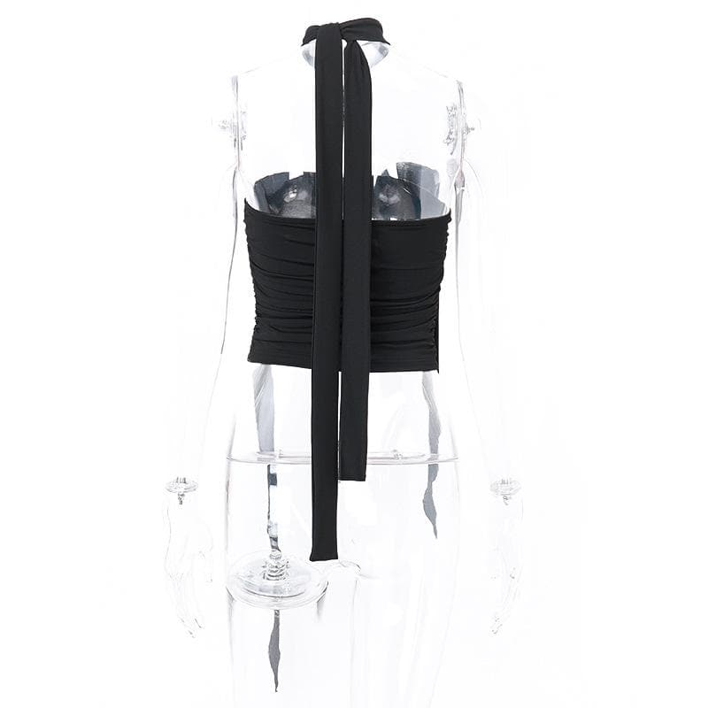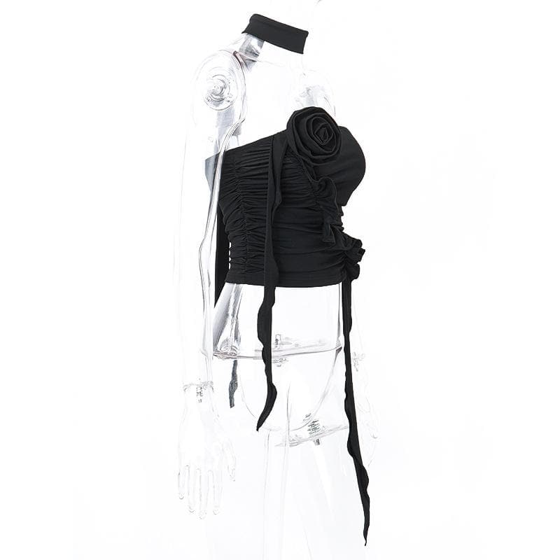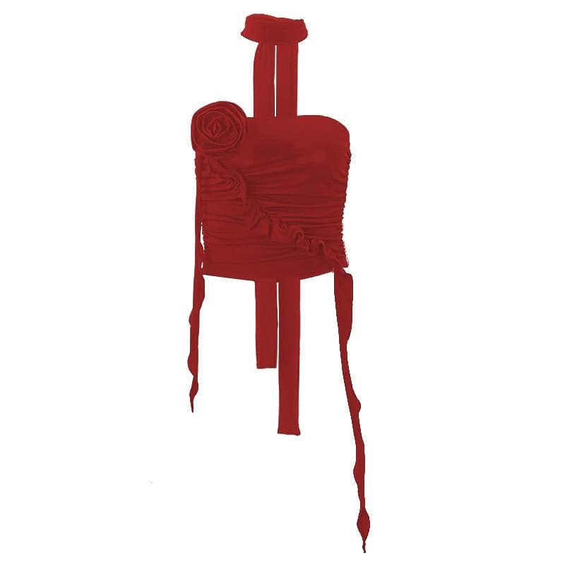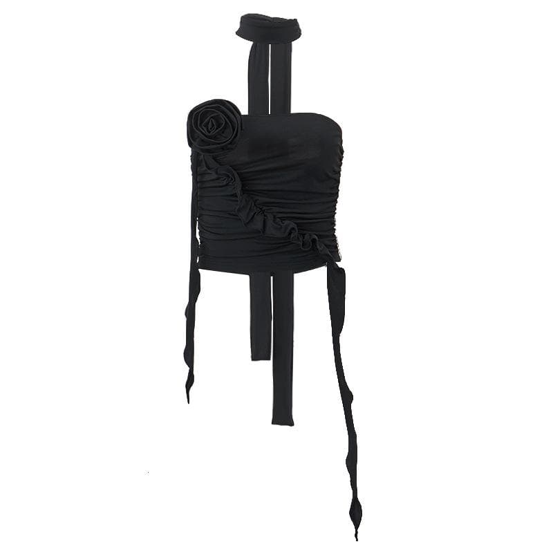 Flower applique solid halter ruched tube crop top