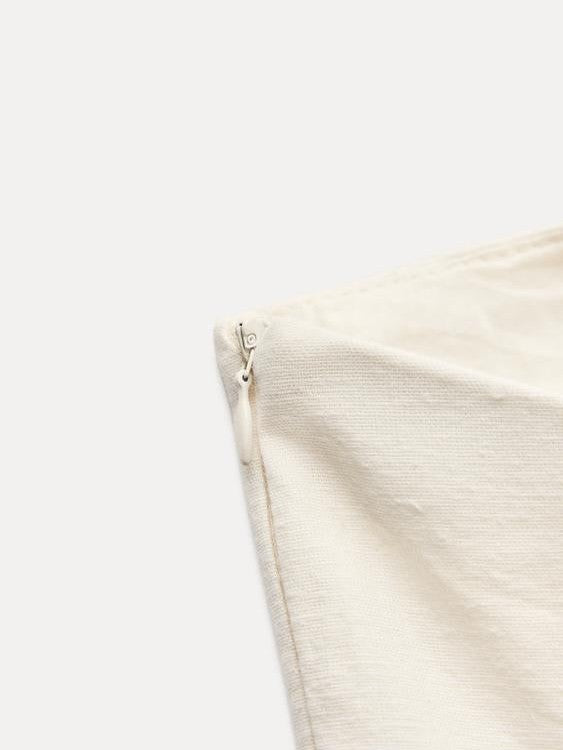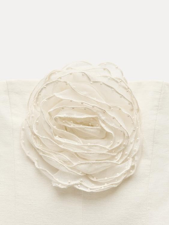 Short dress made of 16% linen. Featuring a straight neckline, exposed shoulders, matching raised flower detail with pearl bead