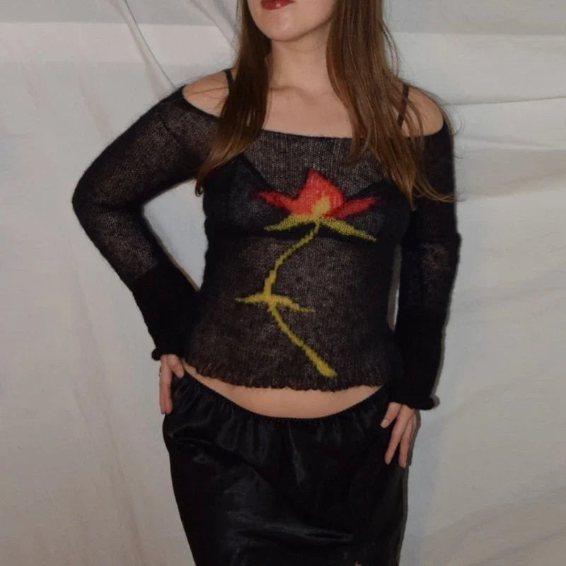 Flower Long Sleeve Cropped Knitted See-Through Sweater Top Women