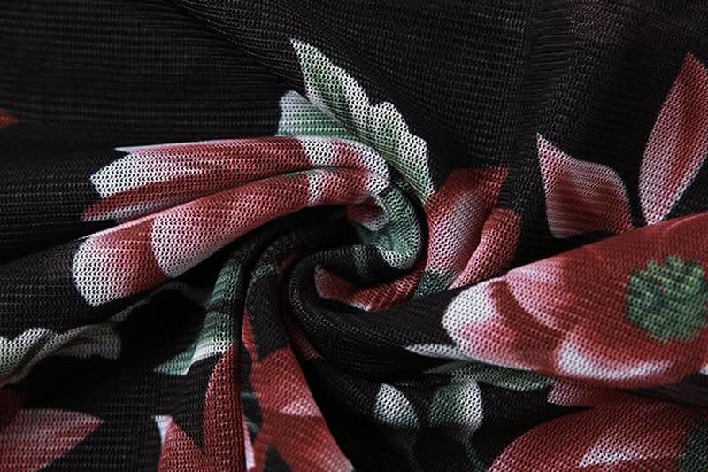 Flower print contrast hollow out long flared sleeve cut out mini dress-final-sale