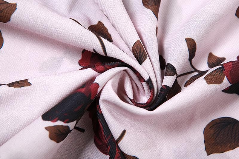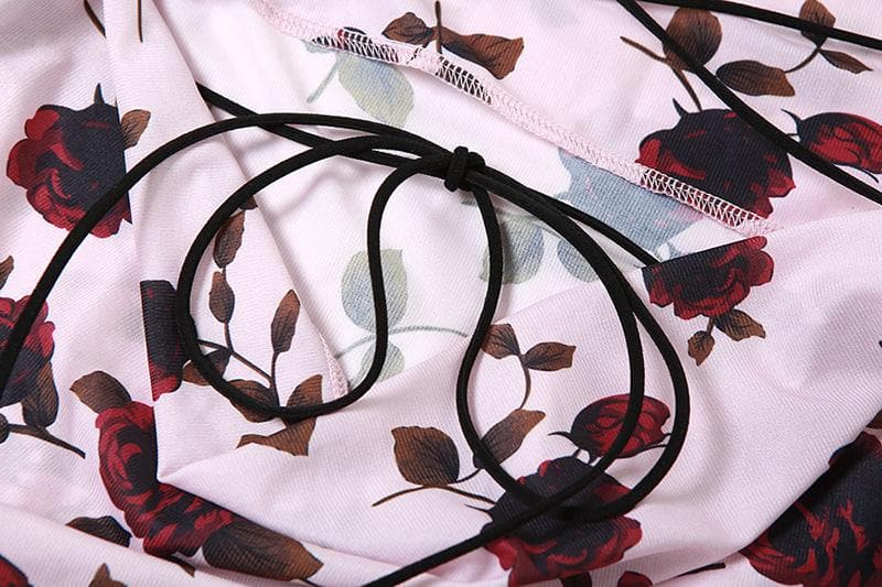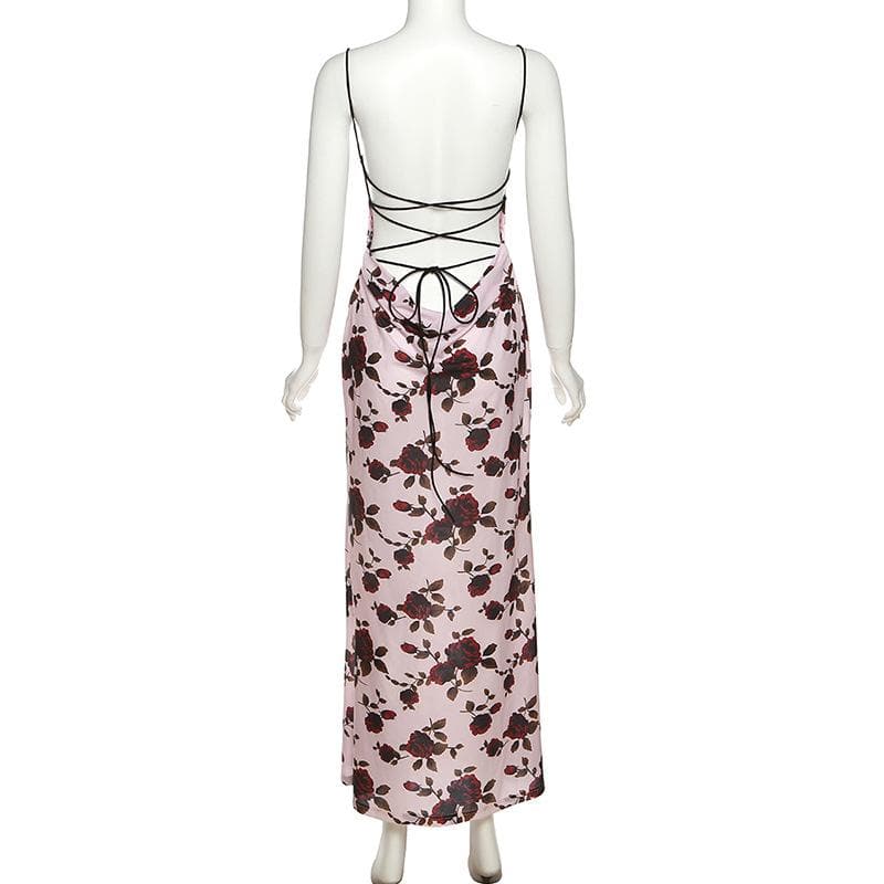 Flower print low cut spaghetti strap contrast lace up backless midi dress