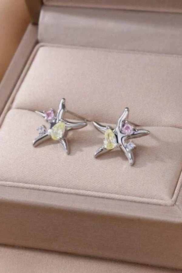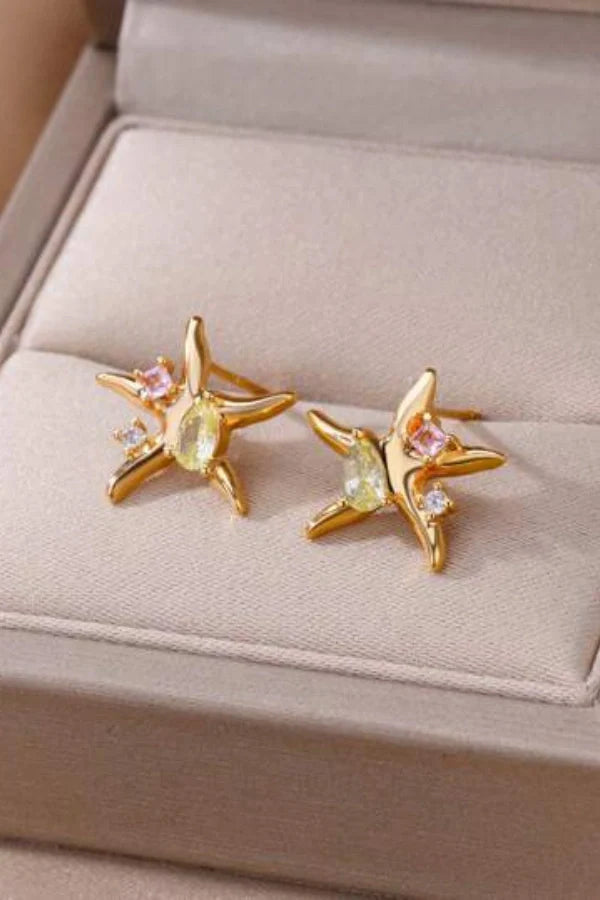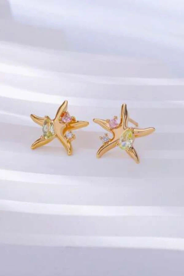 Embrace celestial beauty with the Fontaine Earrings. These captivating earrings feature a cascade of radiant starburst shapes, crafted from gleaming gold-tone metal. Their unique design adds a touch of cosmic glamour to any outfit, while the lightweight construction ensures comfortable wear. Perfect for adding a touch of drama to your everyday style or elevating a special occasion look.The Colorful Zirconia Starfish Stud Earrings are a delicate and charming accessory, perfect for women and girls who love a touch of ocean-inspired elegance. Crafted from high-quality copper and adorned with sparkling multicolored zirconia, these stud earrings capture the beauty of a starfish in a vibrant and sophisticated design. Lightweight and comfortable, they are ideal for daily wear, beach vacations, or adding a playful sparkle to any outfit.