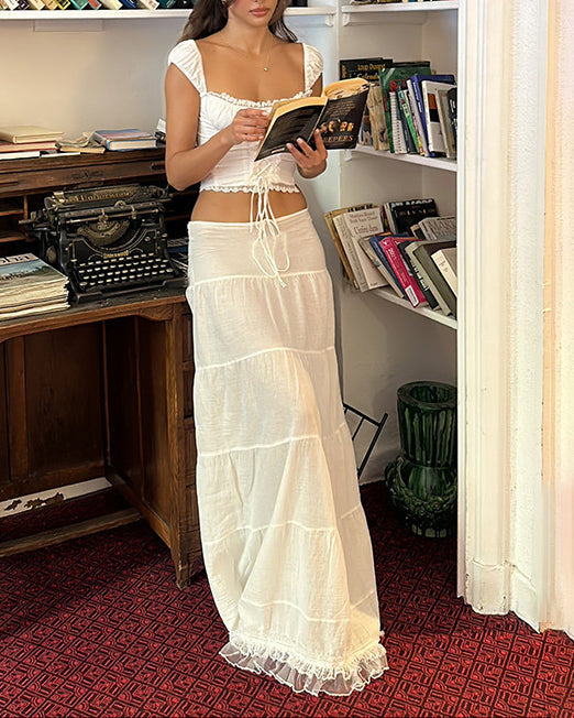 French Square Neck Halter Top With Lace Patchwork Skirt Suit