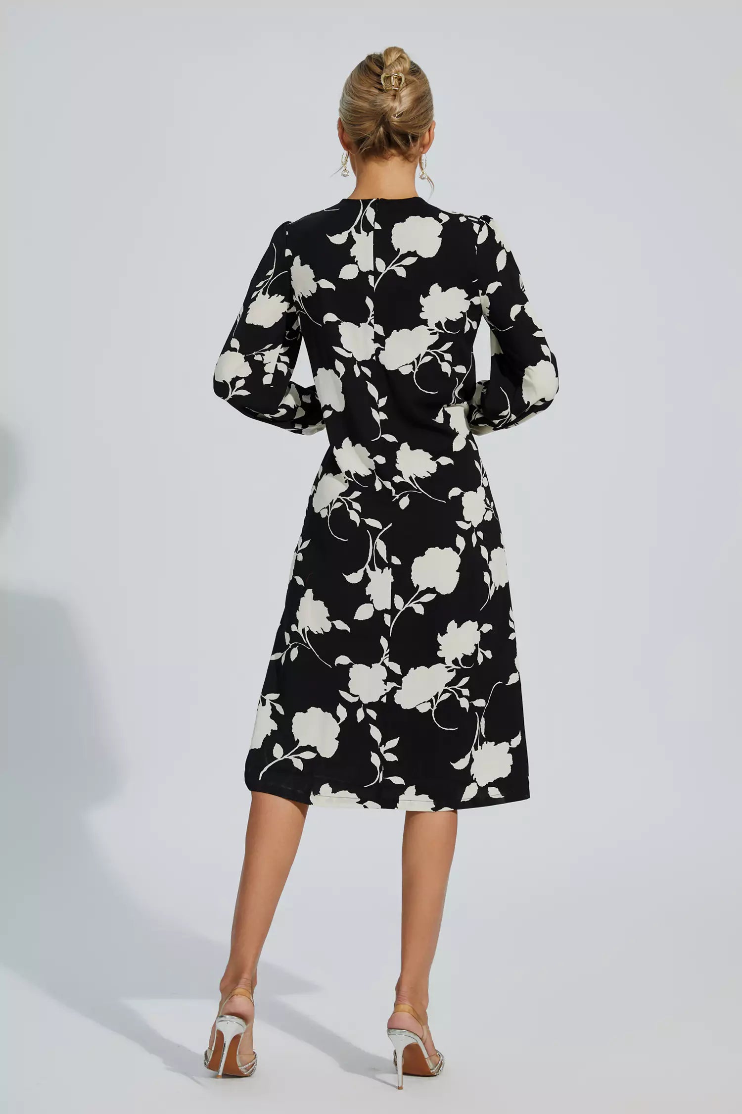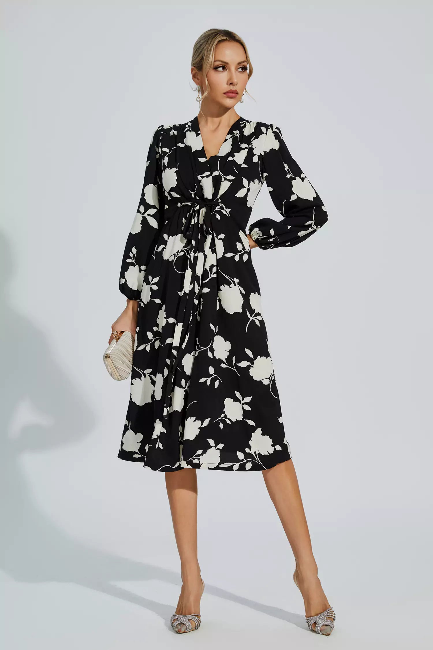 The Galilea Black Floral Girded Midi Dress exudes elegance and sophistication. Featuring a stunning black and white contrasting floral print, slims and flatters. This long-sleeved dress is both graceful and stylish. Perfect for any special occasion, this dress will make you feel confident and chic.
