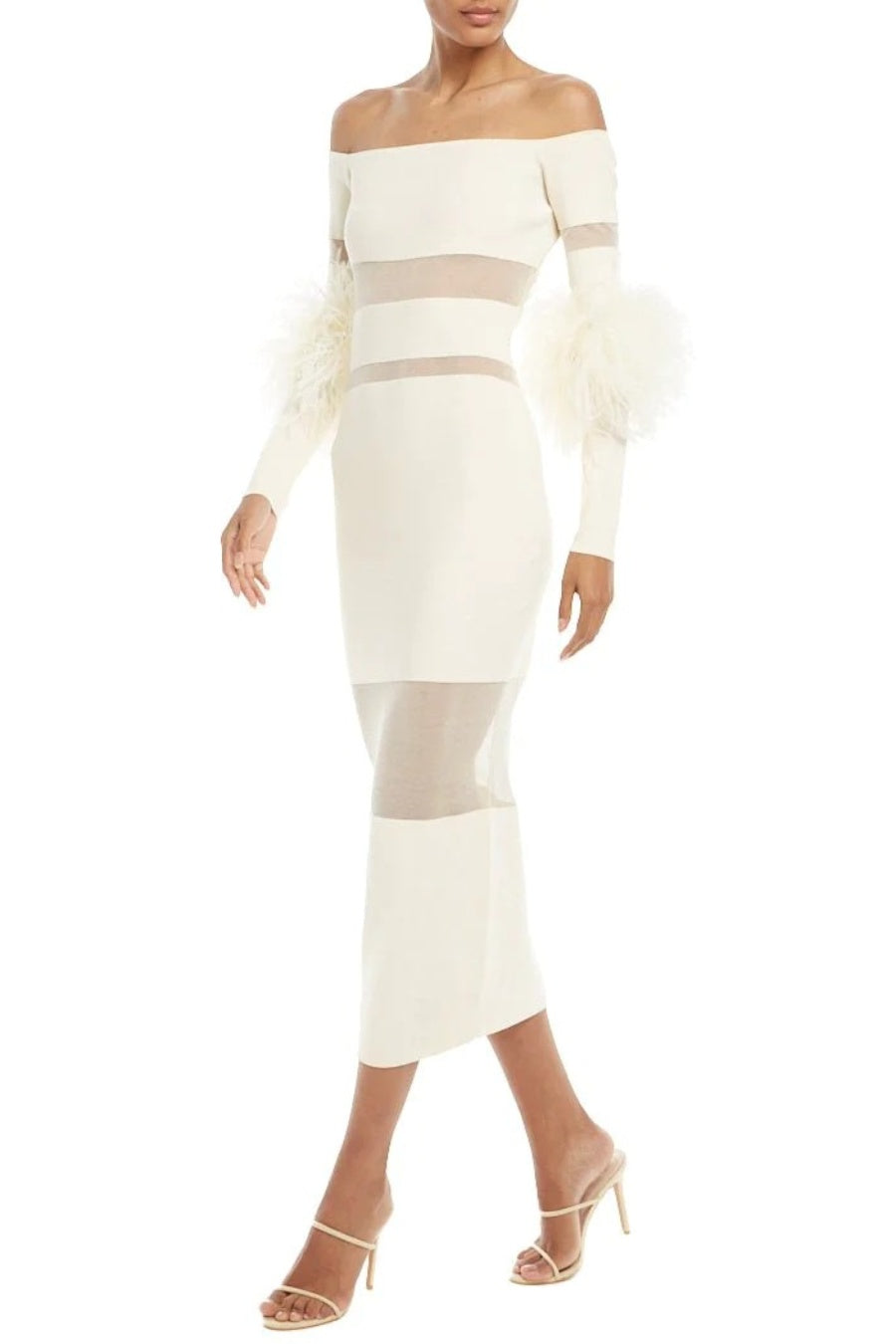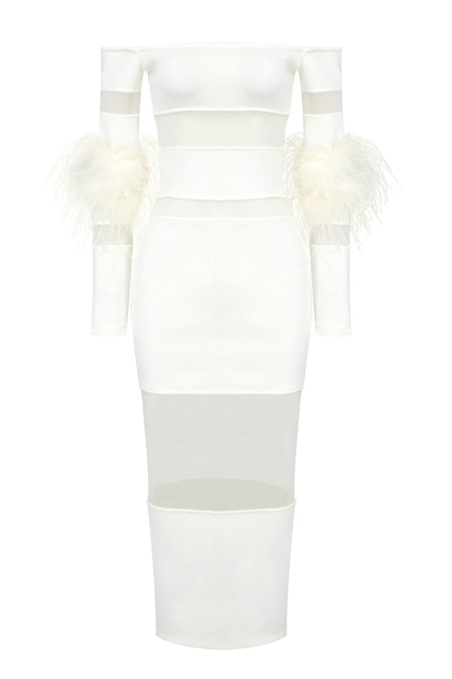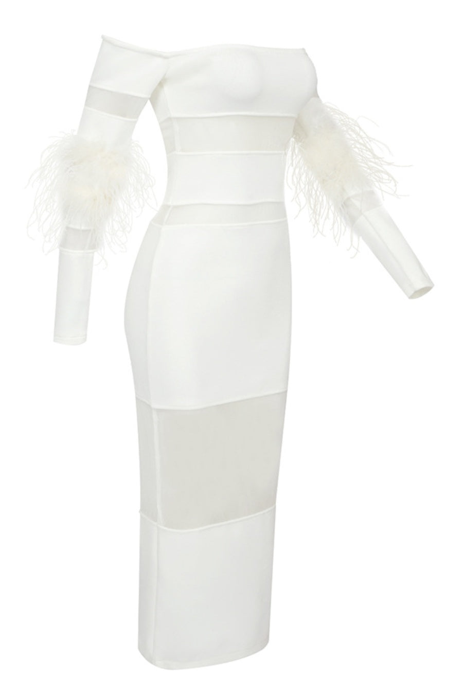 Genesis Off Shoulder Feather Mesh Midi Bandage Dress - White