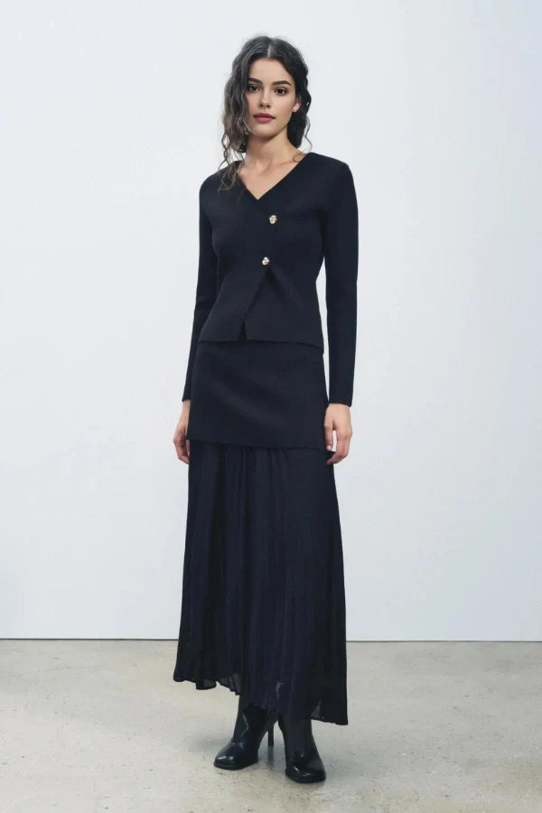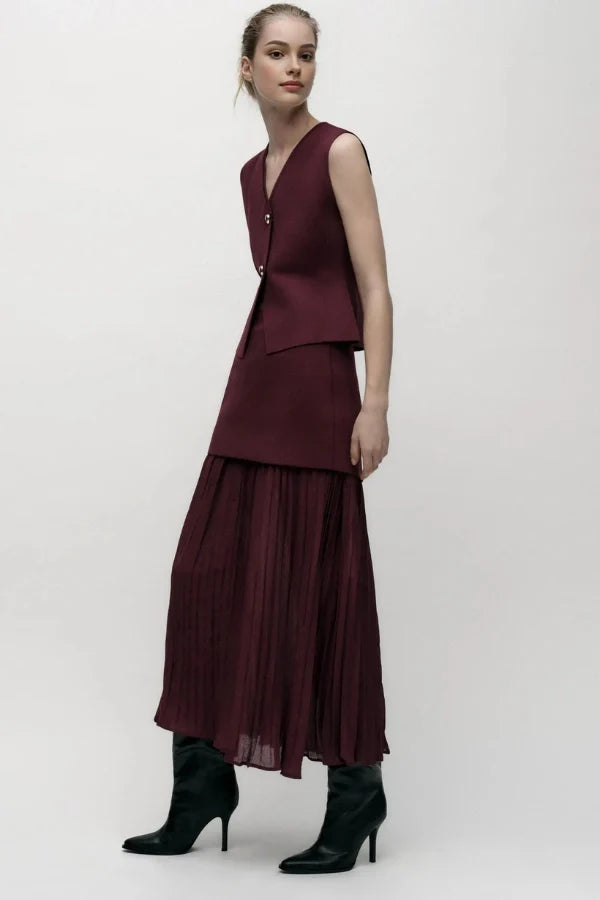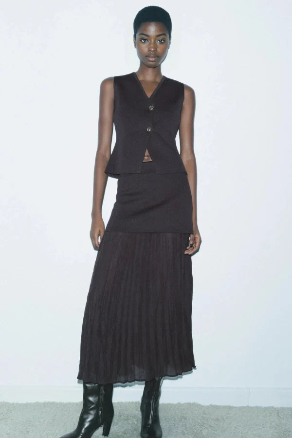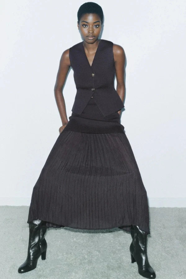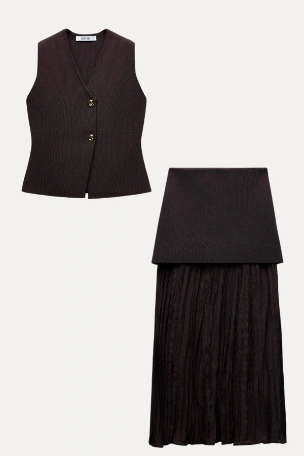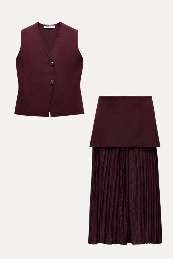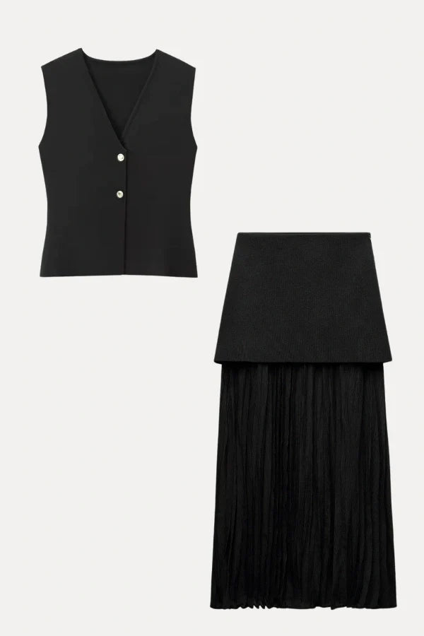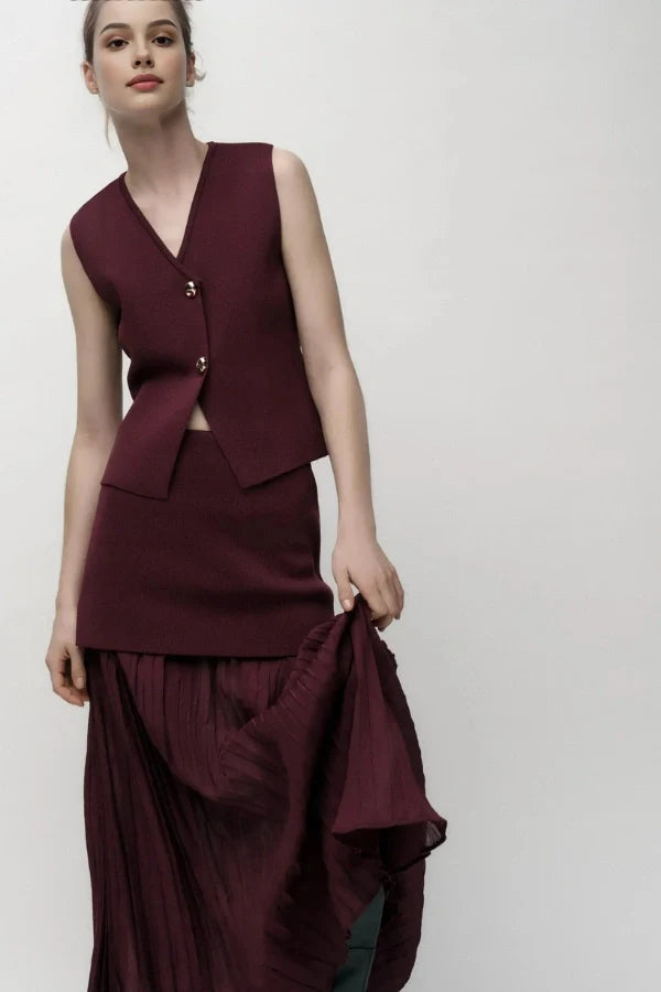 Elevate your office style with the Georgia Knitted Set. This chic ensemble features a quirky V-neck vest paired with a high-waisted, pleated skirt and an elegant ankle-length option. Perfect for workdays or after-hours fun!