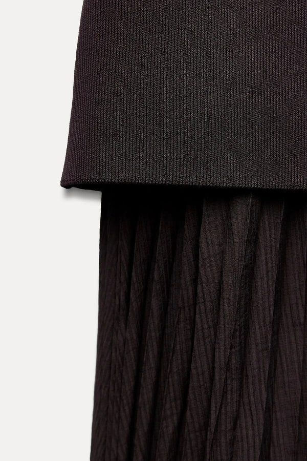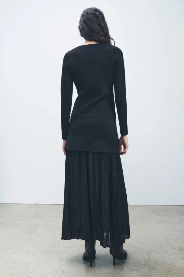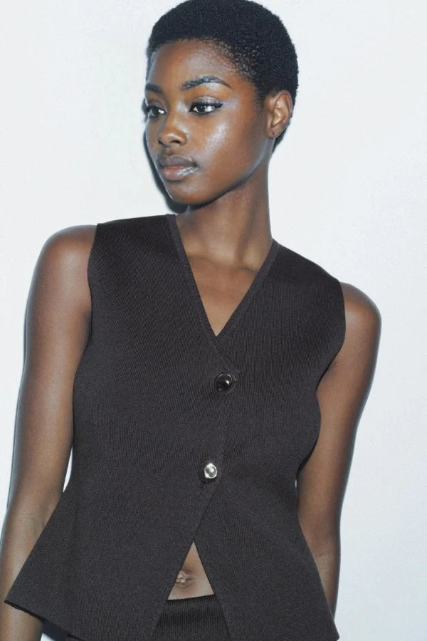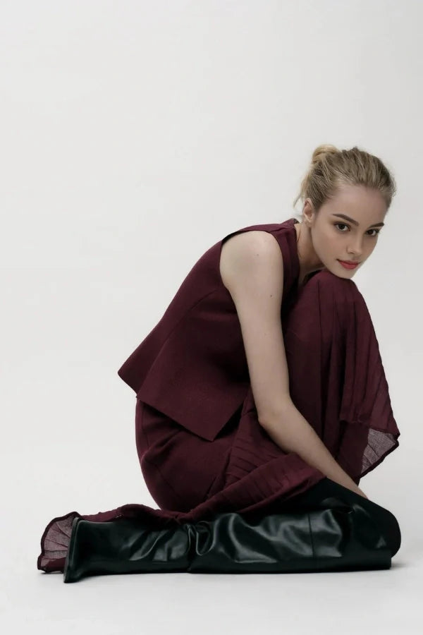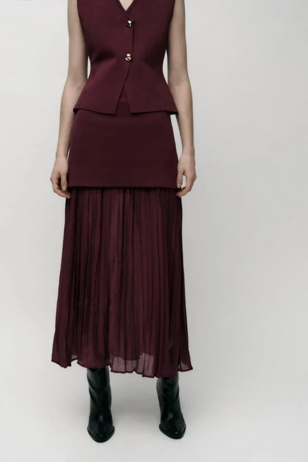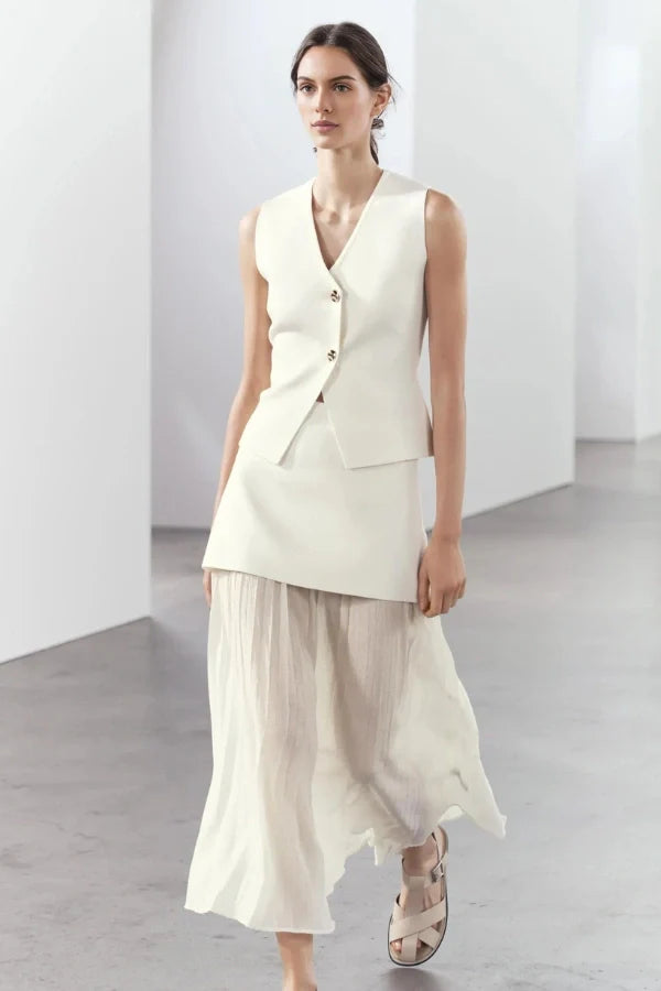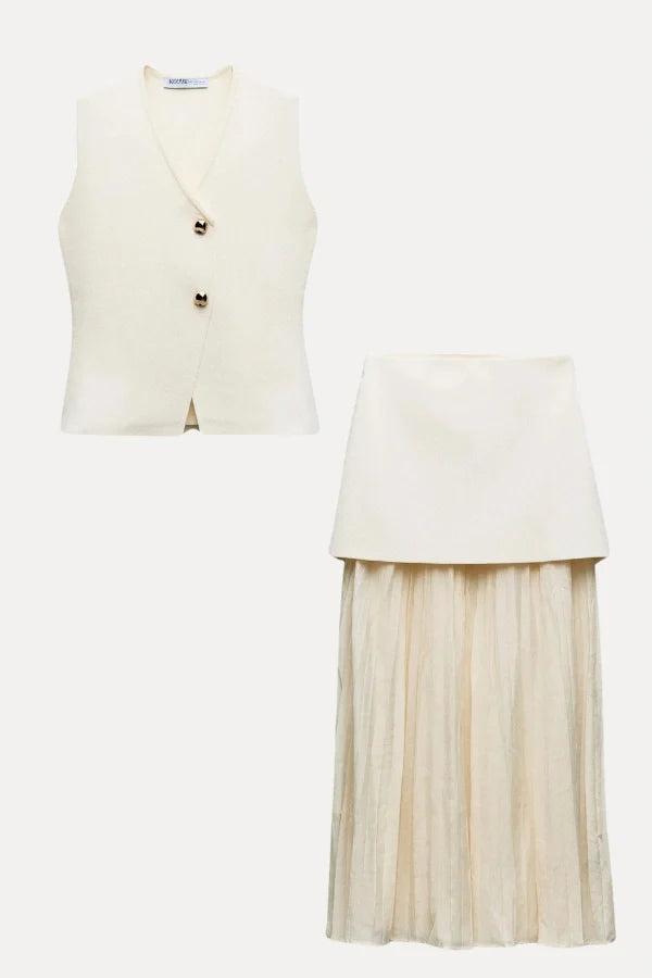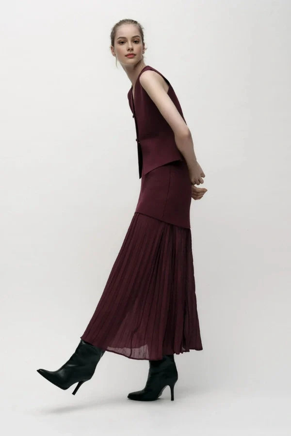 Elevate your office style with the Georgia Knitted Set. This chic ensemble features a quirky V-neck vest paired with a high-waisted, pleated skirt and an elegant ankle-length option. Perfect for workdays or after-hours fun!