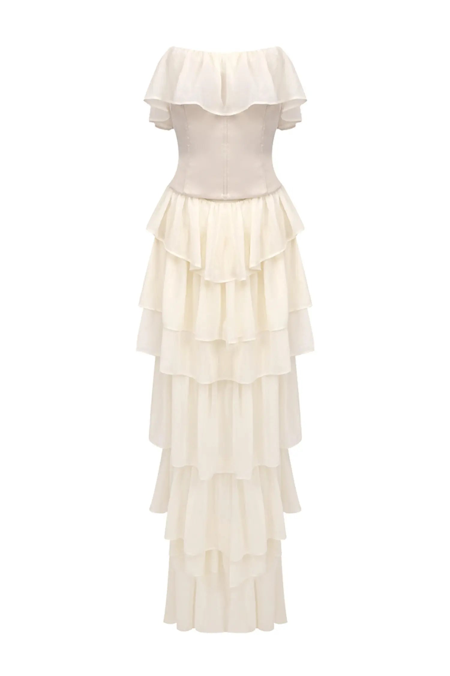 Elevate your style with the Gerald Apricot Off Shoulder Dress. This exquisite off-shoulder dress exudes vintage charm with its cake-like design and long length. The set includes a dress and a bodice, offering versatility in wearing options. Make a statement and embrace the timeless elegance of this retro-inspired ensemble.