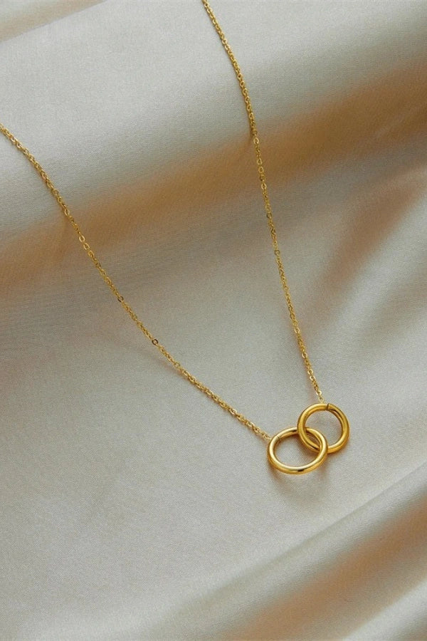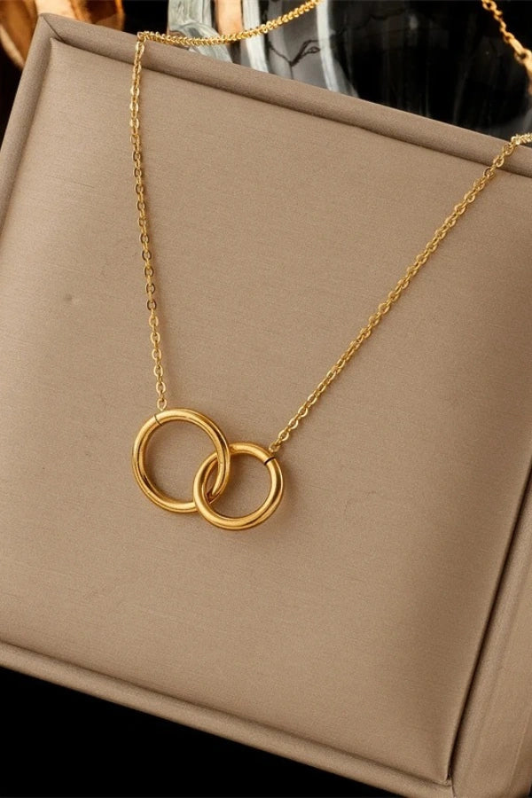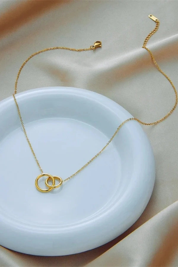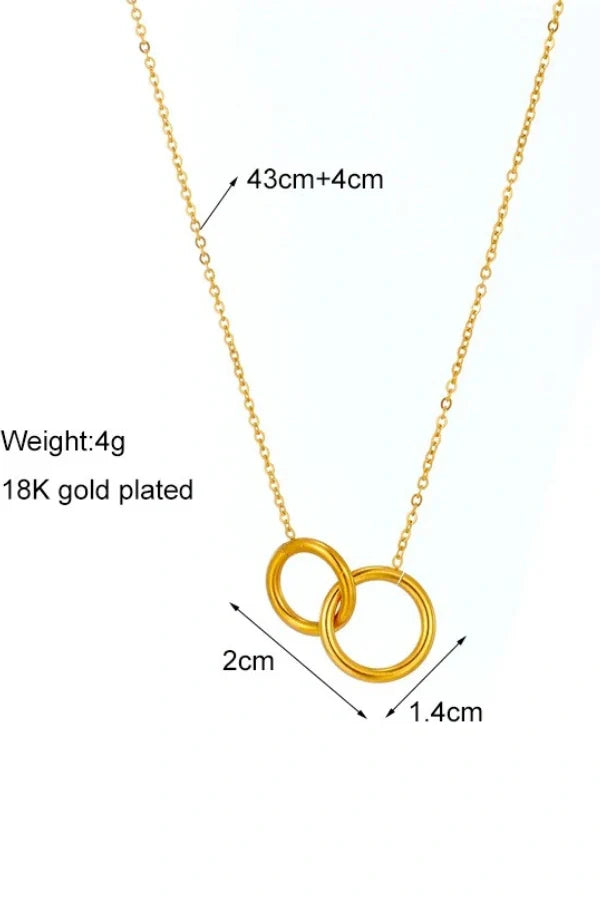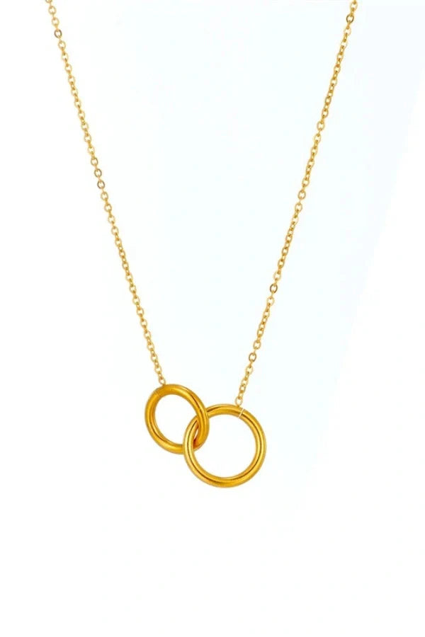 The Gildara necklace features a sleek, stainless steel double ring pendant in a luxurious gold tone, designed to complement the clavicle with elegance and sophistication. Perfect for adding a chic touch to any outfit, this fashionable piece combines timeless beauty with modern style. Ideal for women who appreciate delicate body jewelry that speaks volumes without overpowering.