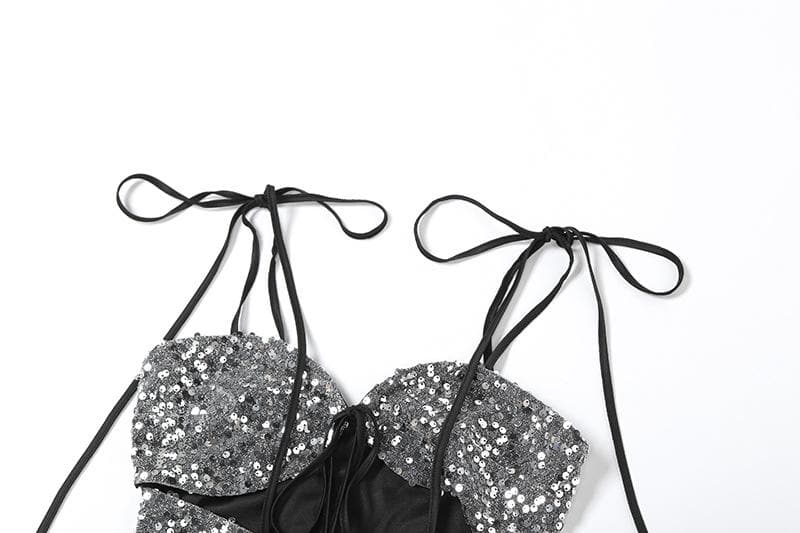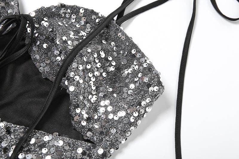 Glitter hollow out self tie backless v neck cami cut out top