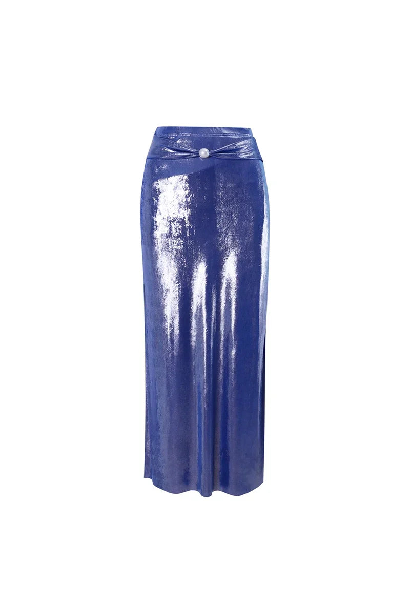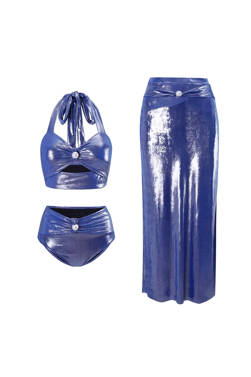 Radiating elegance and allure, this misty blue one-piece swimsuit features a glossy finish, a daring deep V-neckline, and exquisite pearl detailing. Designed for modern muses, it perfectly balances luxury and sensuality.