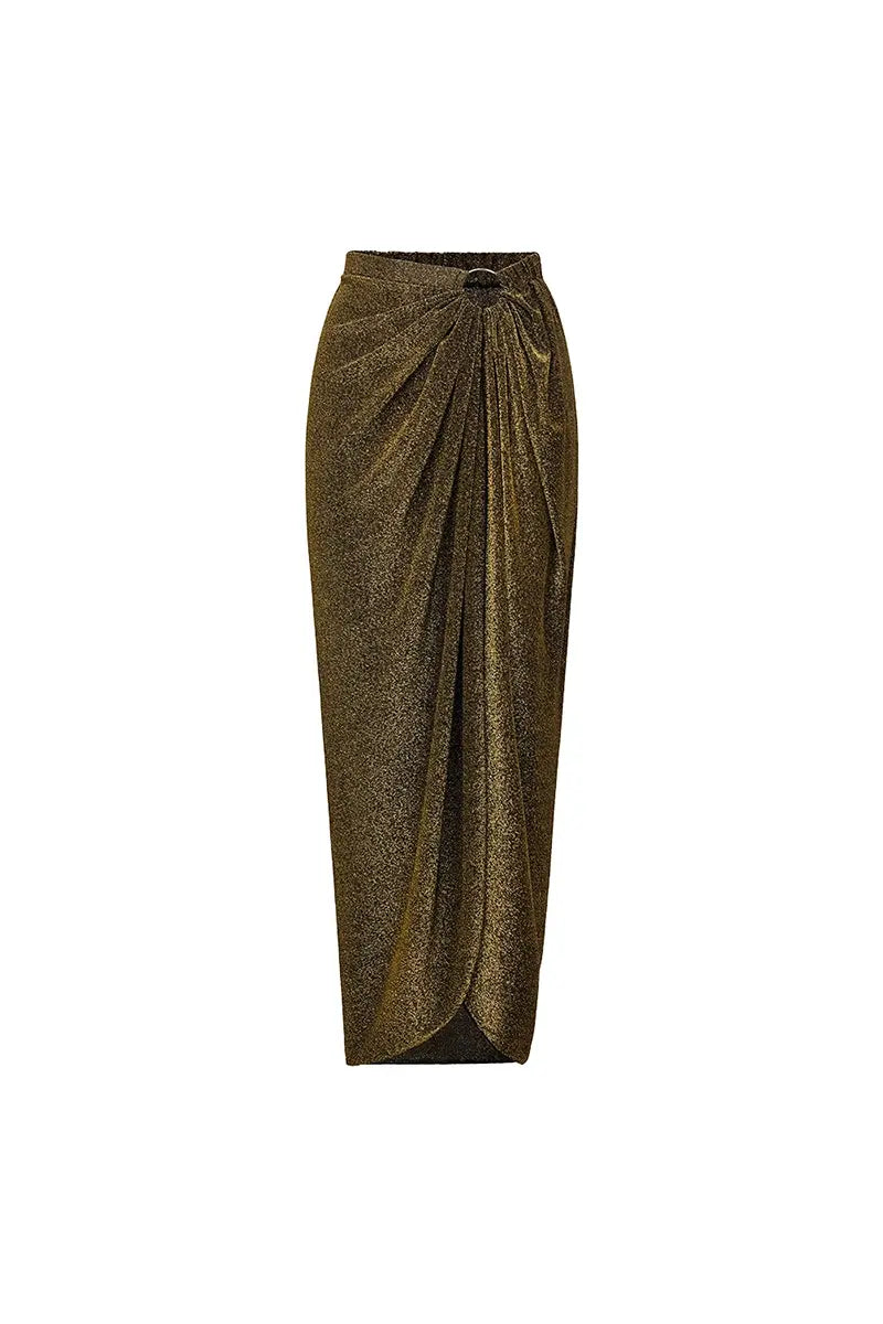 This glossy one-piece swimsuit set stands out with its lustrous finish and bold gold-tone circular buckle embellishments. Designed to catch the light, the swimsuit features strategic cutouts that accentuate the waist and neckline while maintaining a sleek and sculpted silhouette. The metallic accents add a luxurious edge, elevating the overall look. Made with high-stretch material, it offers both comfort and structure. The coordinated cover-up or skirt completes the set with a touch of glamour.