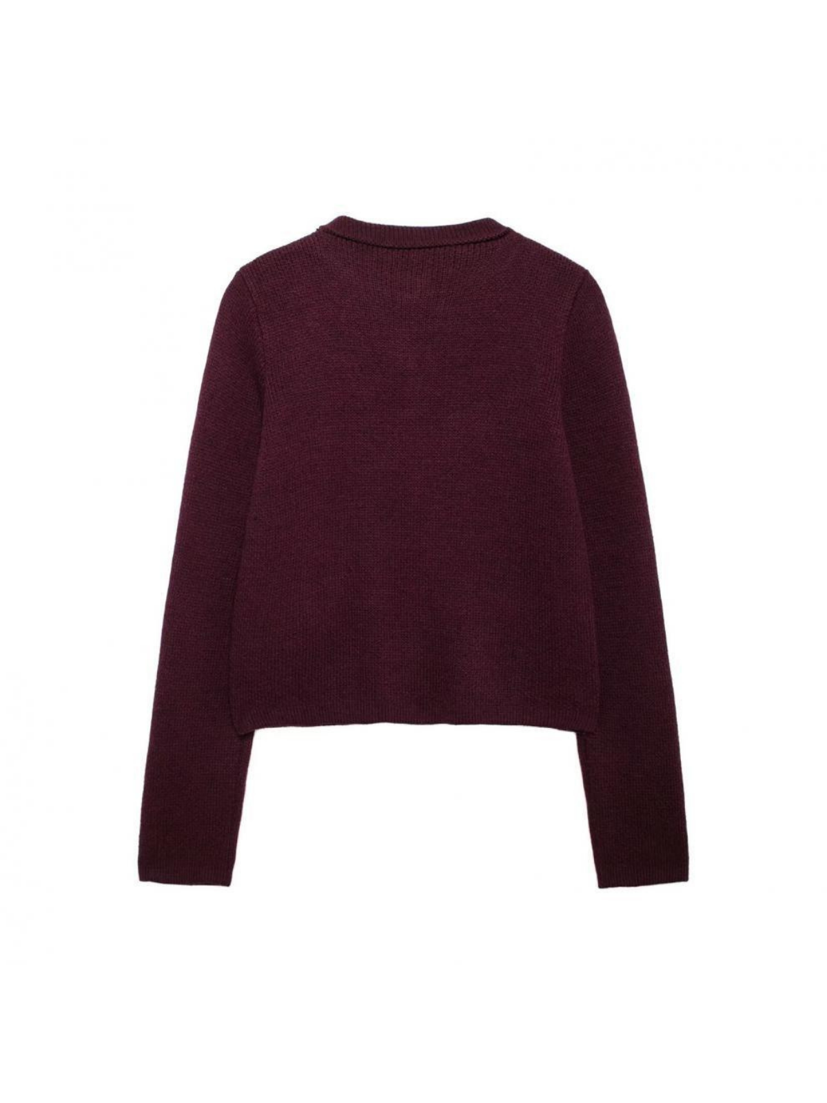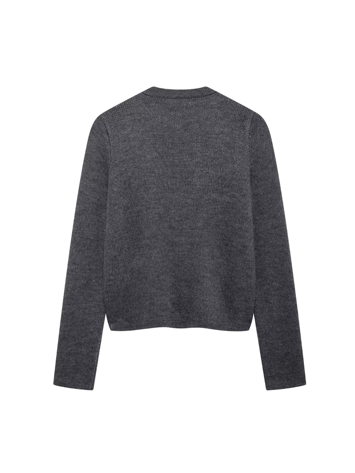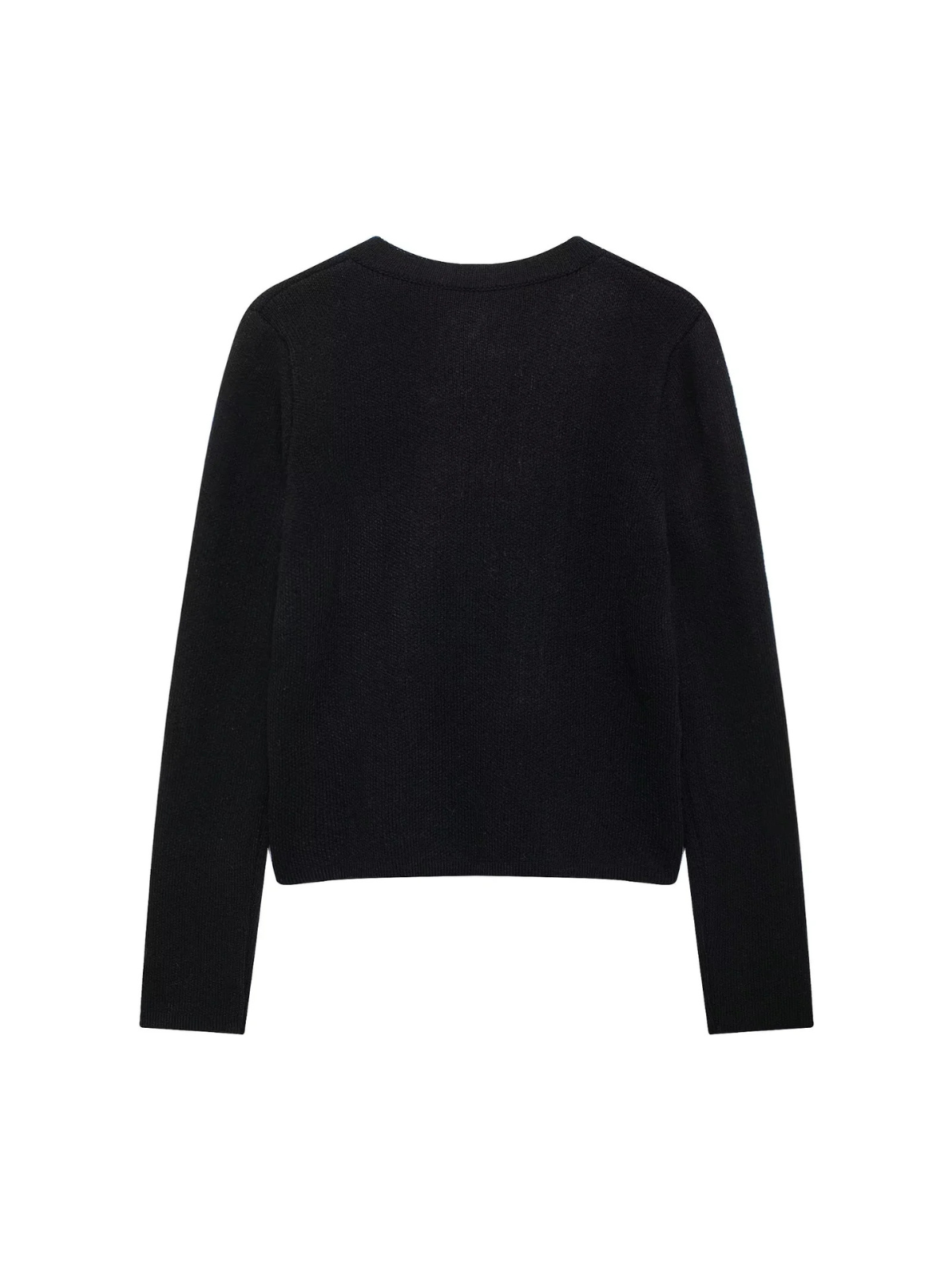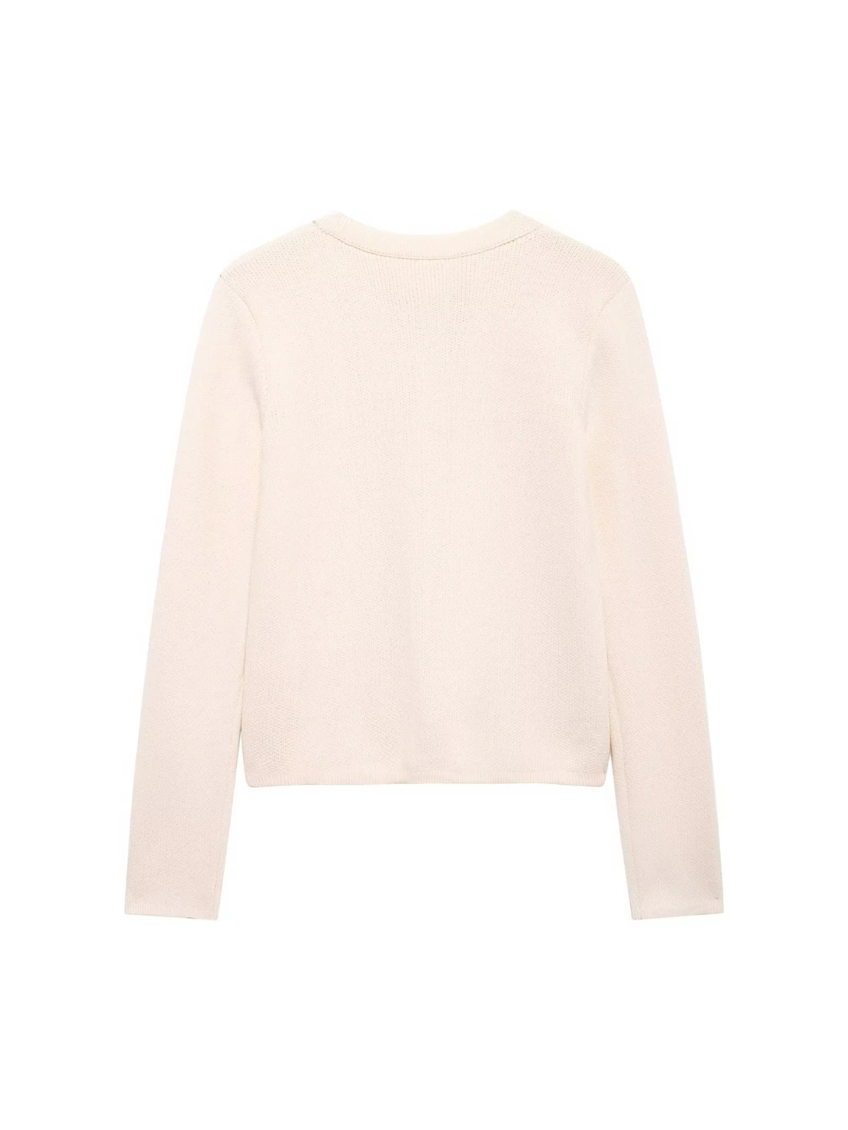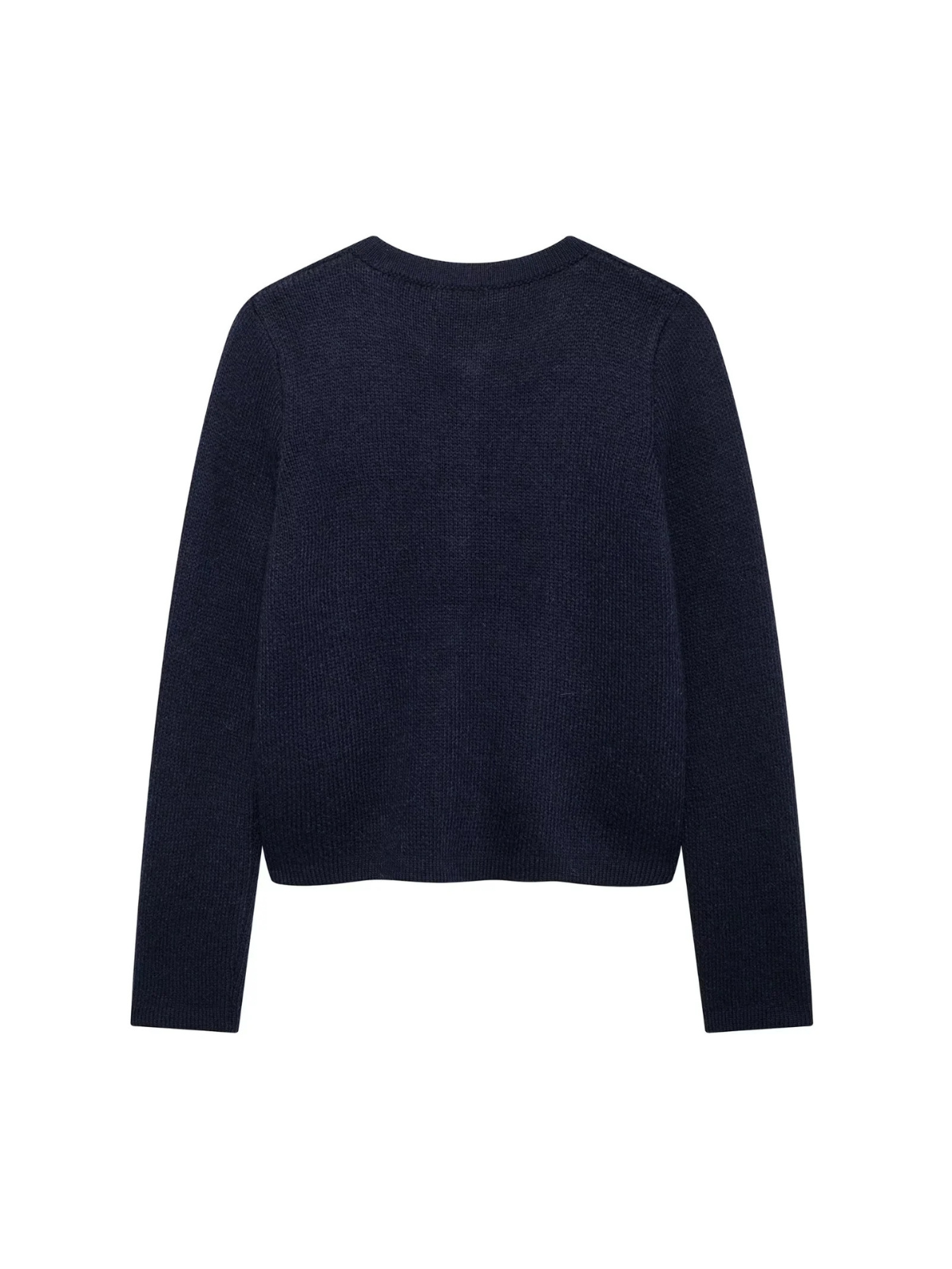 Design: A refined short knitted cardigan featuring elegant gold button detailing, a structured silhouette, and a timeless minimalist design. The sophisticated accents add a touch of luxury to a classic piece.
