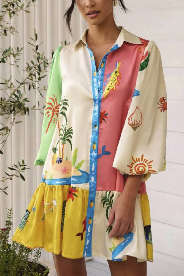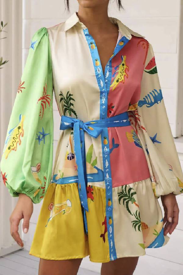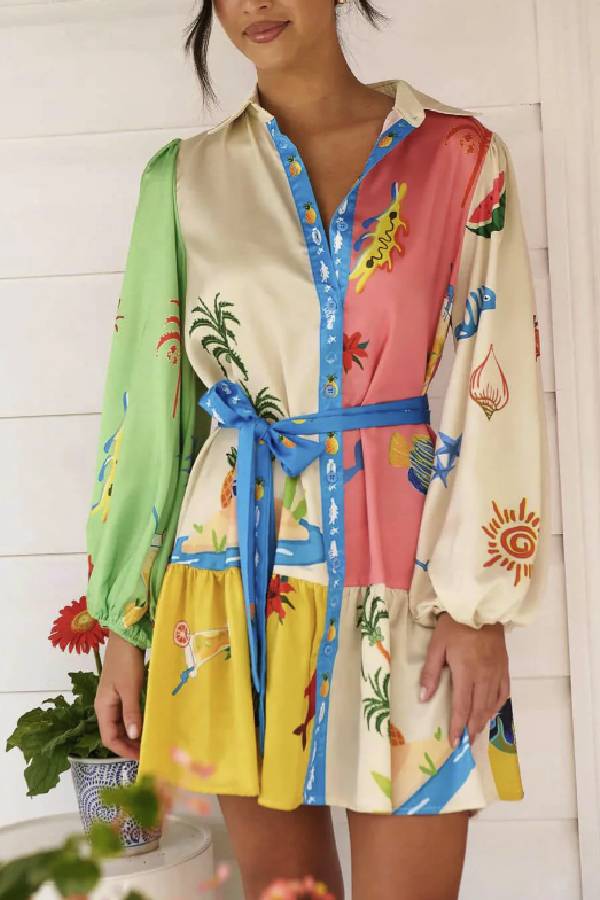 Graffiti Print Lace-Up Cardigan Loose Short Dress with Wide Hem