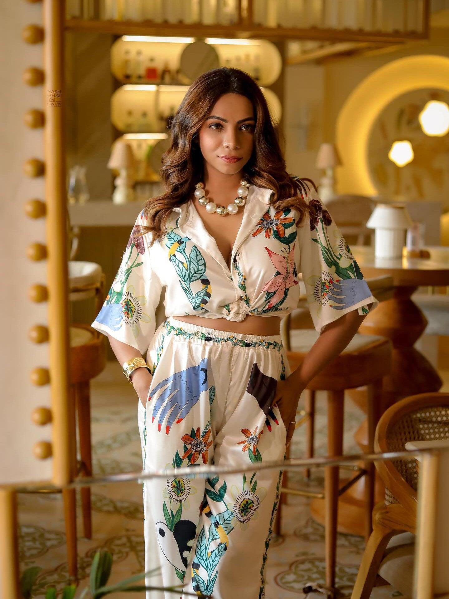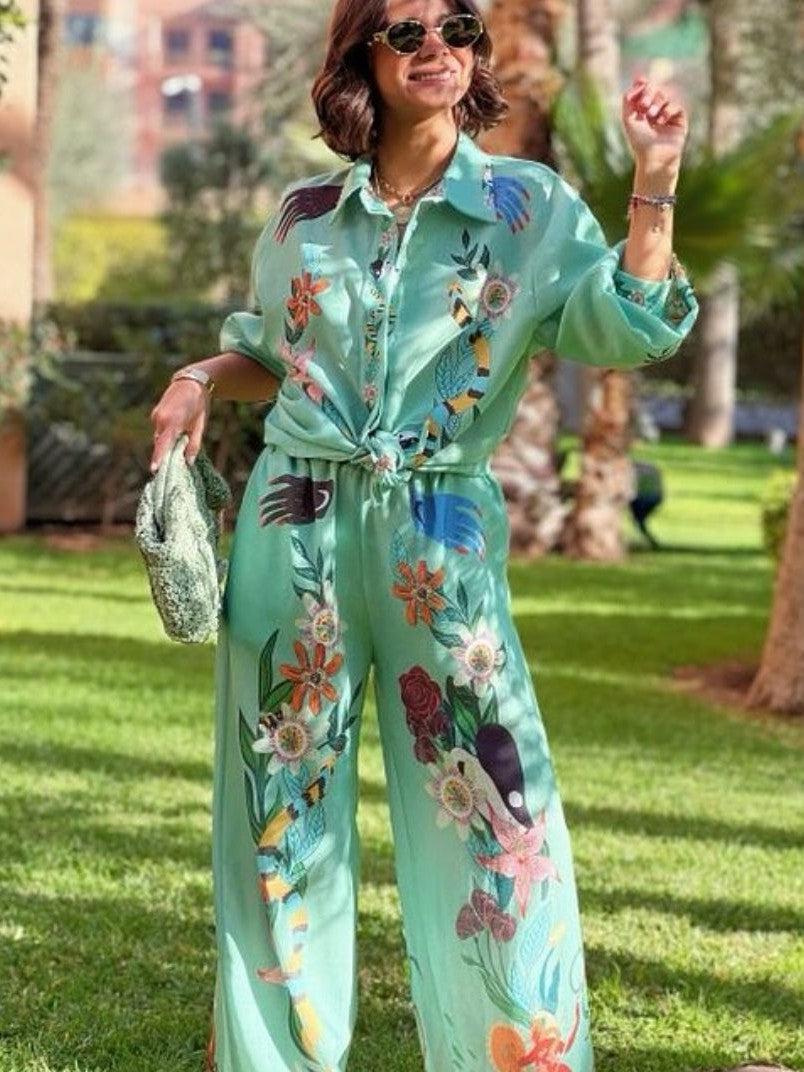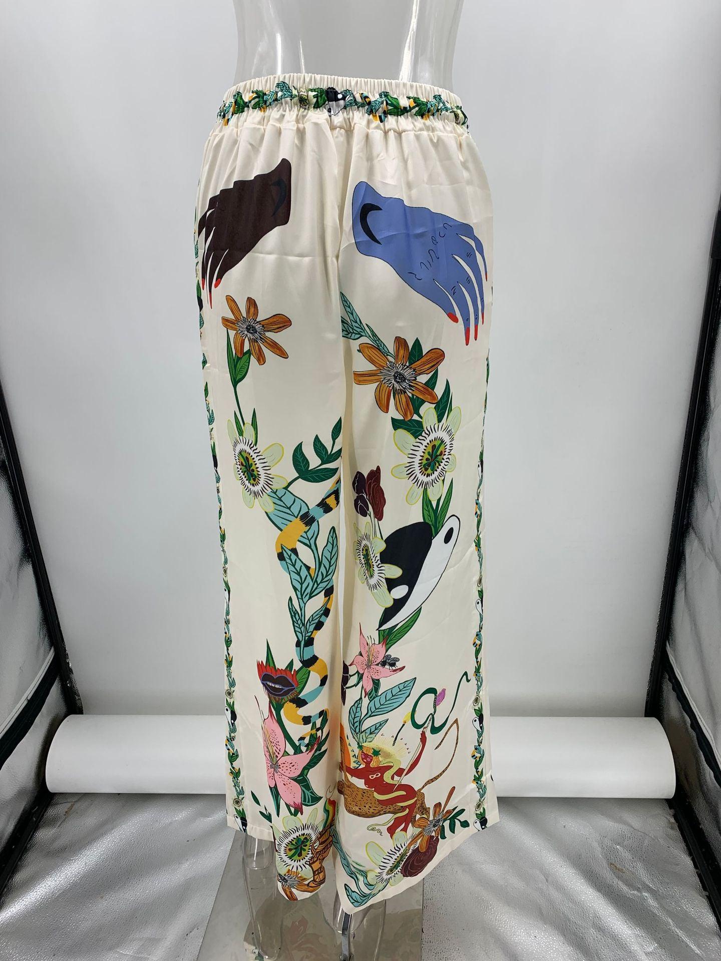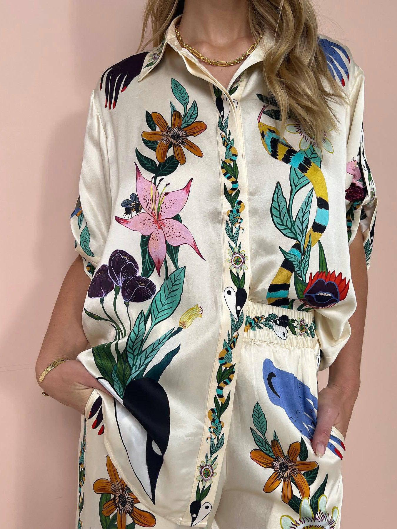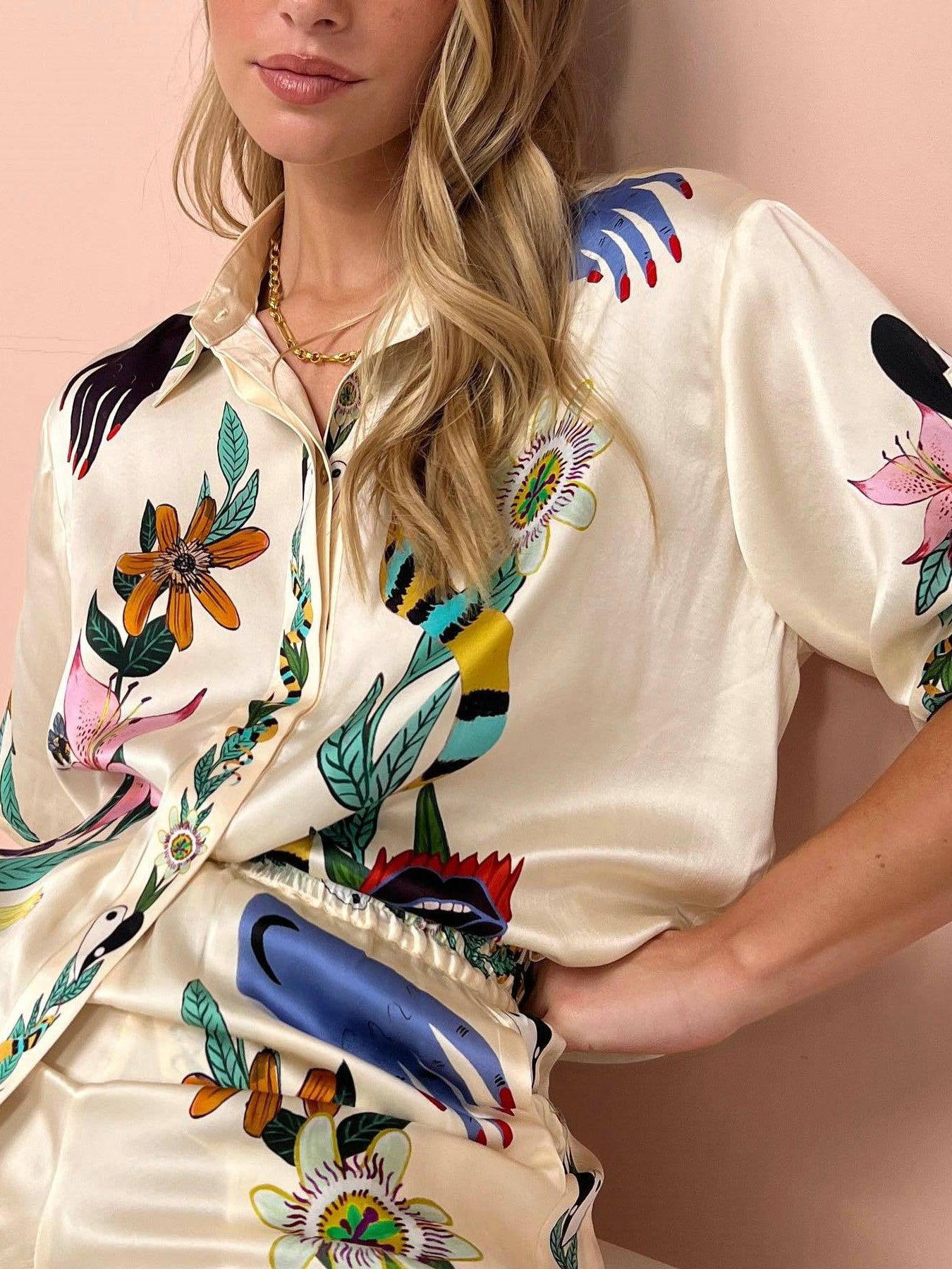 Graffiti Print Satin Short Sleeve Shirt & Pant Coord Set