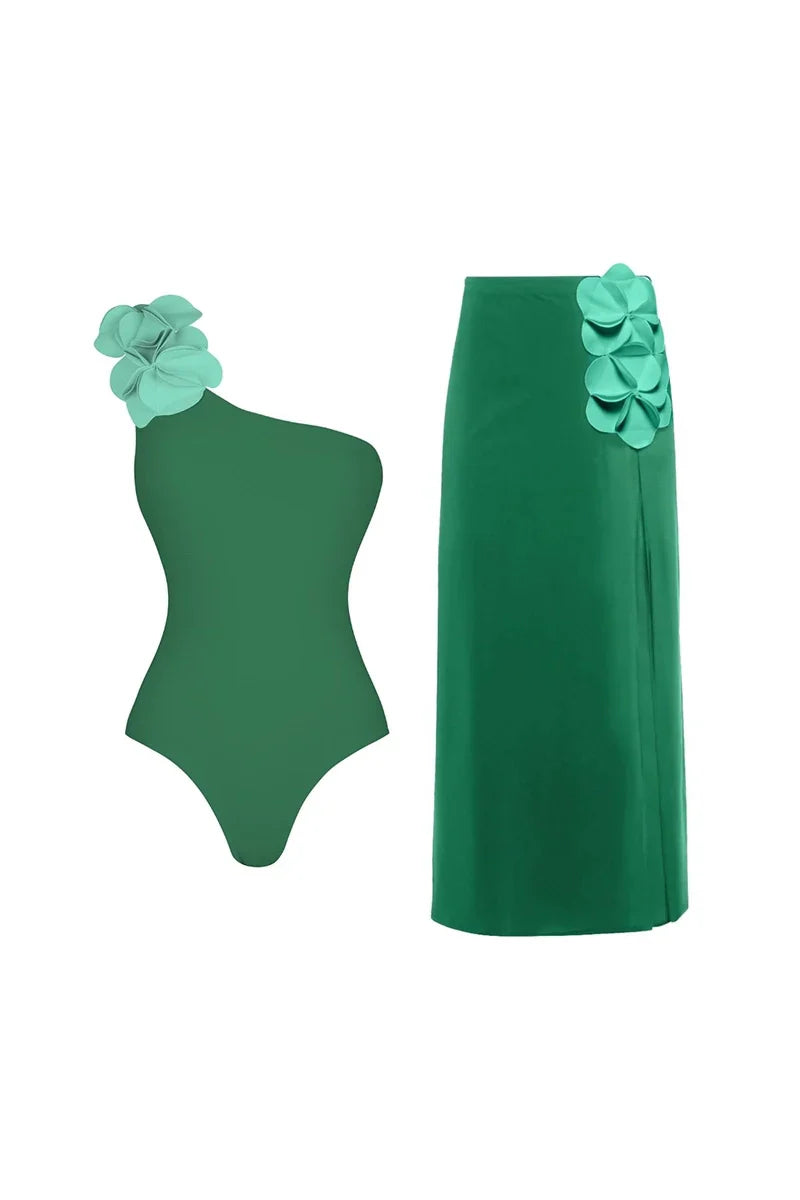 Green One-Shoulder 3D Floral Swimsuit