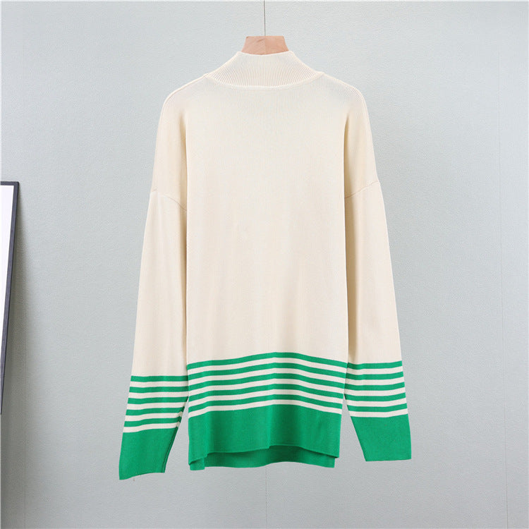 Green - Striped Half-Turtleneck Sweater Two Piece Set