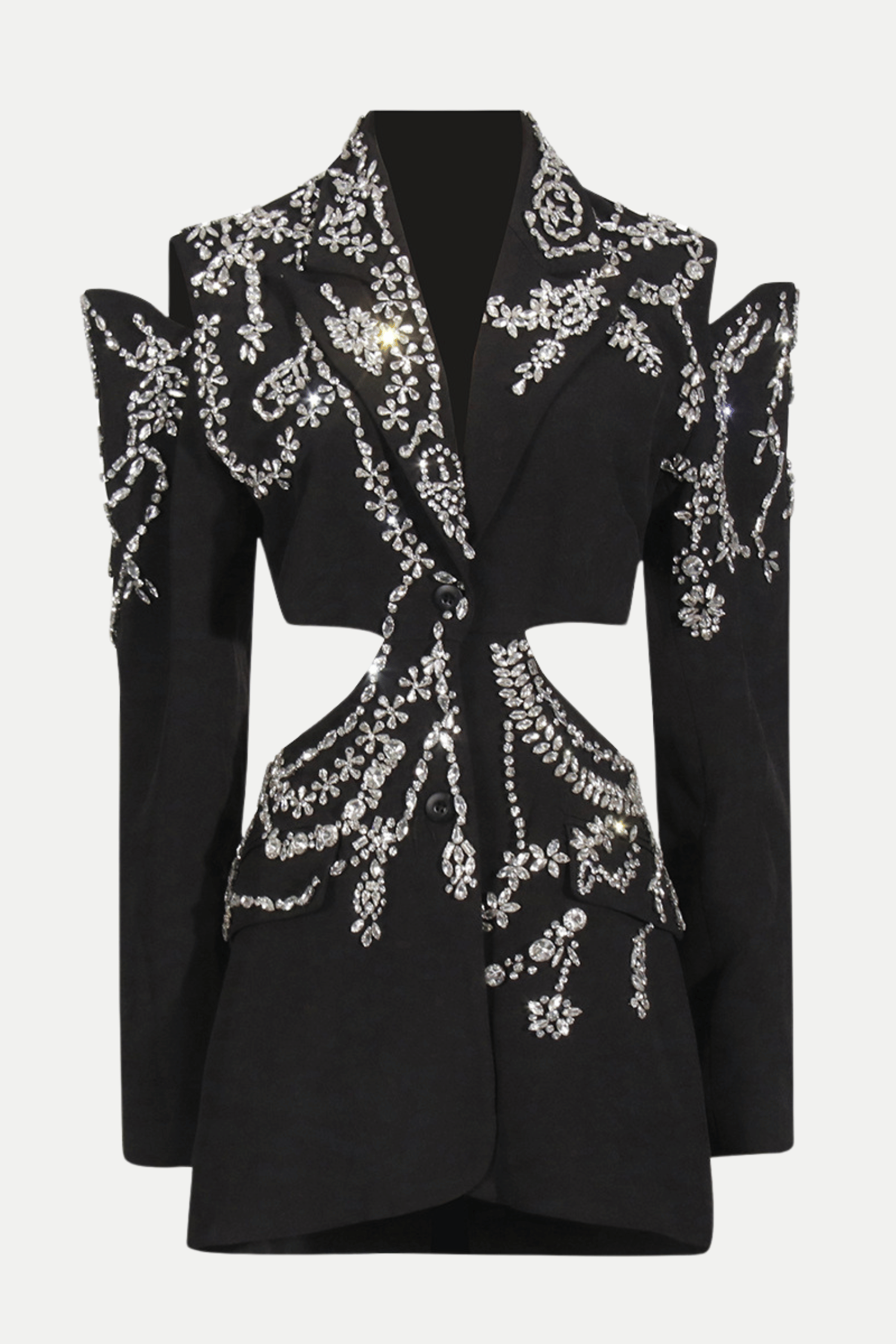 Unleash your inner fashionista with our Gustina Crystal-embellished Cutout Blazer. This luxurious piece features intricate crystal detailing and daring cutouts, adding a touch of sophistication and glamour to your wardrobe. Elevate any outfit and make a statement with this exclusive blazer.