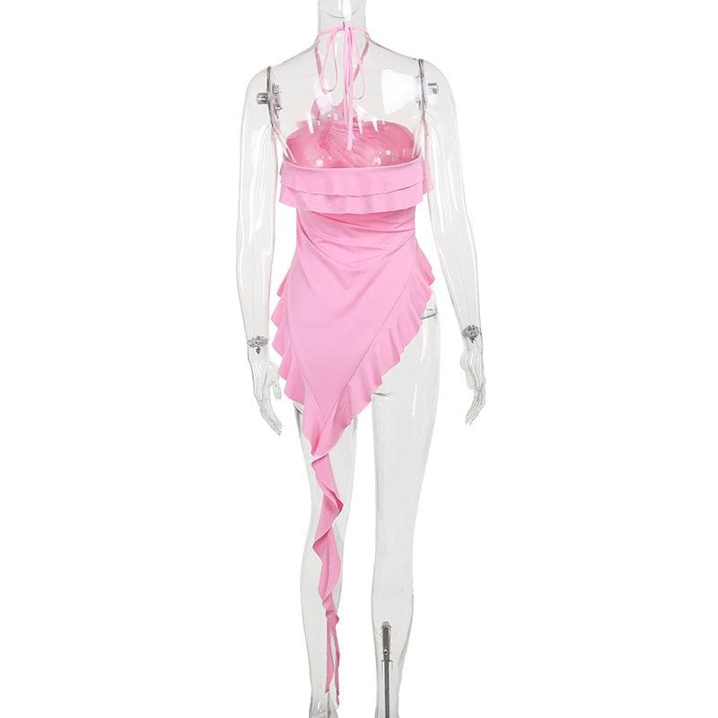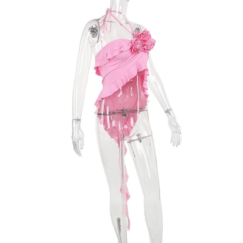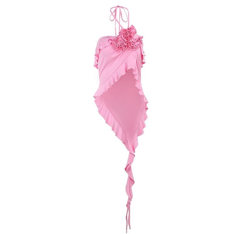 Halter flower applique ruffle irregular crop top
