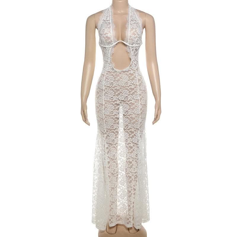 Halter lace see through hollow out cut out maxi dress-final-sale