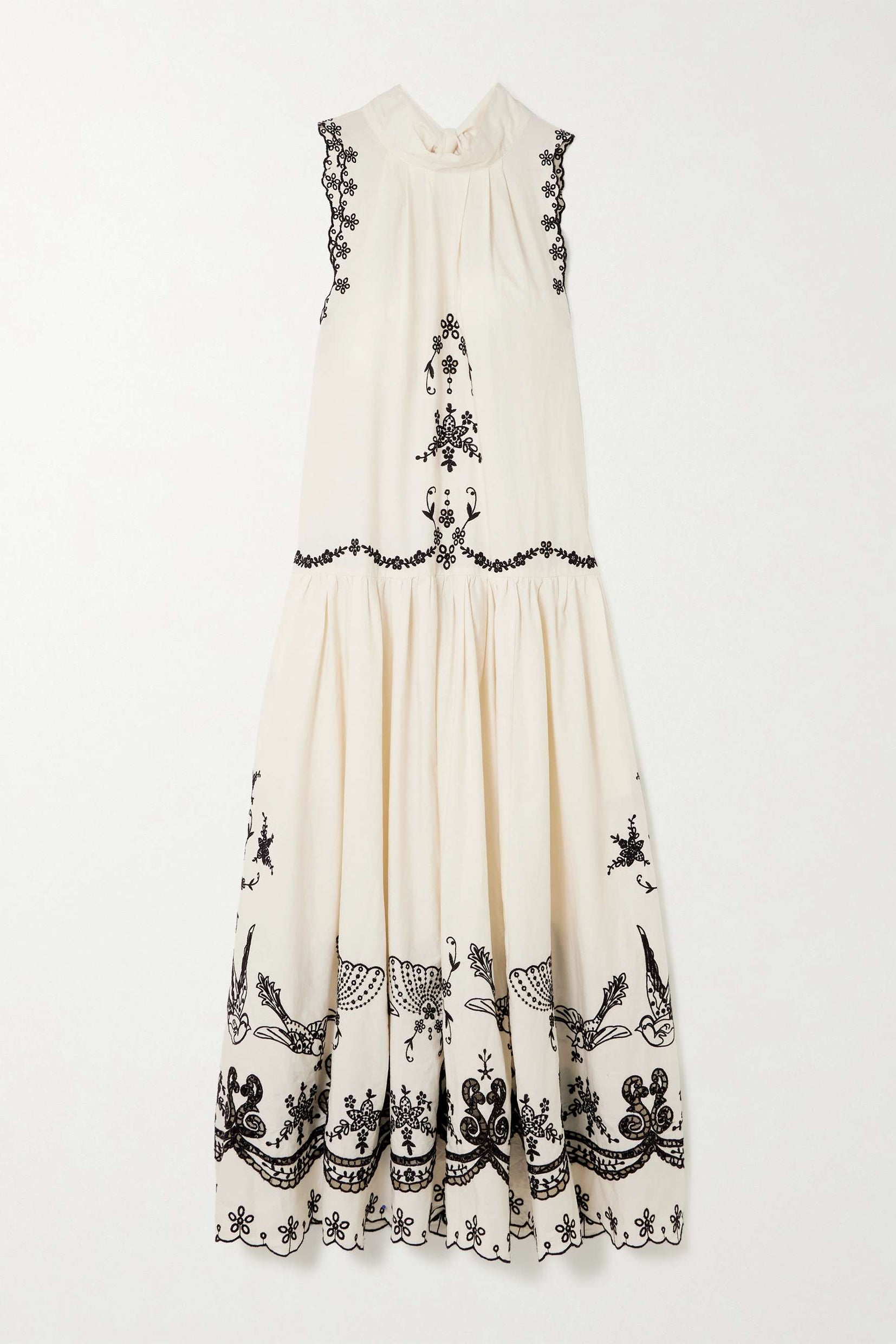 - Sleeveless, halter neck, white, embroidery, midi dress
