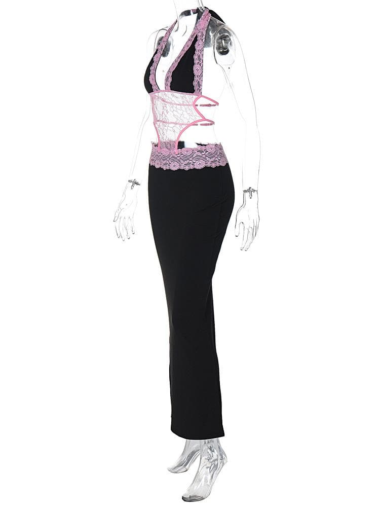 Halter patchwork lace deep v neck maxi dress