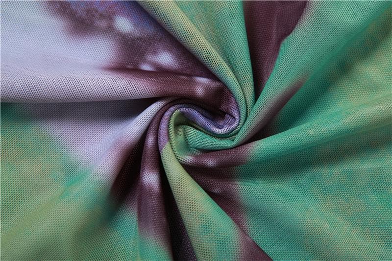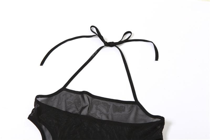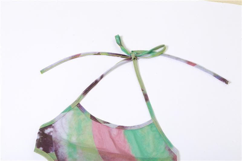 Halter self tie contrast print sheer mesh backless hollow out cut out maxi dress