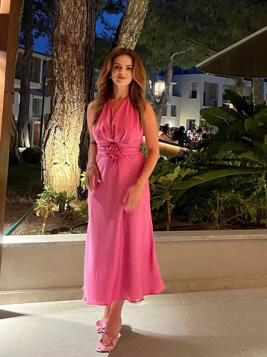 Halterneck Backless Flower Applique Waist Band Maxi Dress