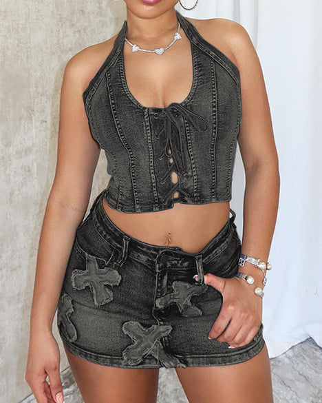- Diverse combinations: This Halterneck Washed Sleeveless Denim Skirt can be easily paired with a variety of tops and accessories, from simple T-shirts to fashionable tank tops, to show off different styles. Whether it is for daily outings or beach vacations, it is your perfect choice.