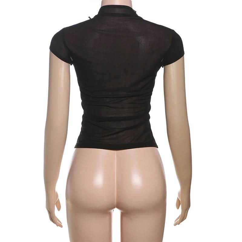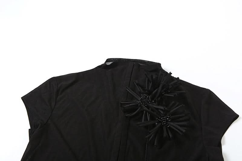 High neck short sleeve flower applique button top