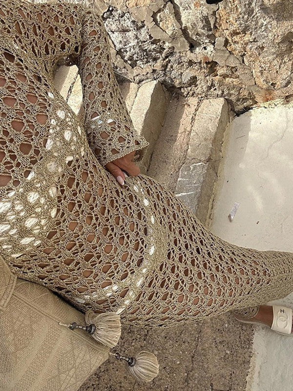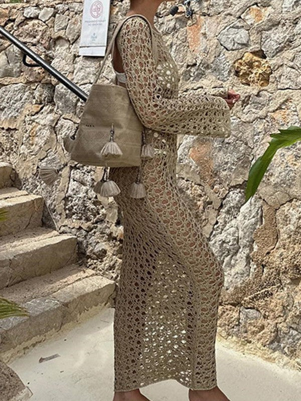 Hollow Out Cutout Long Sleeved round Neck Maxi Dress Holiday Beach Overskirt
