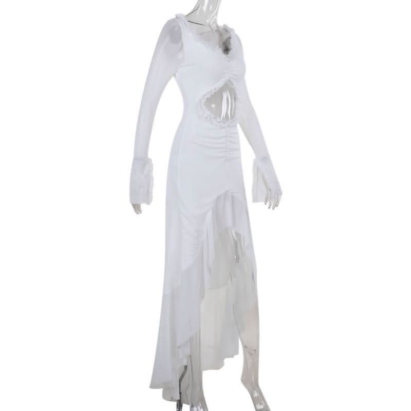 Hollow out long sleeve ruched ruffle mesh cut out maxi dress