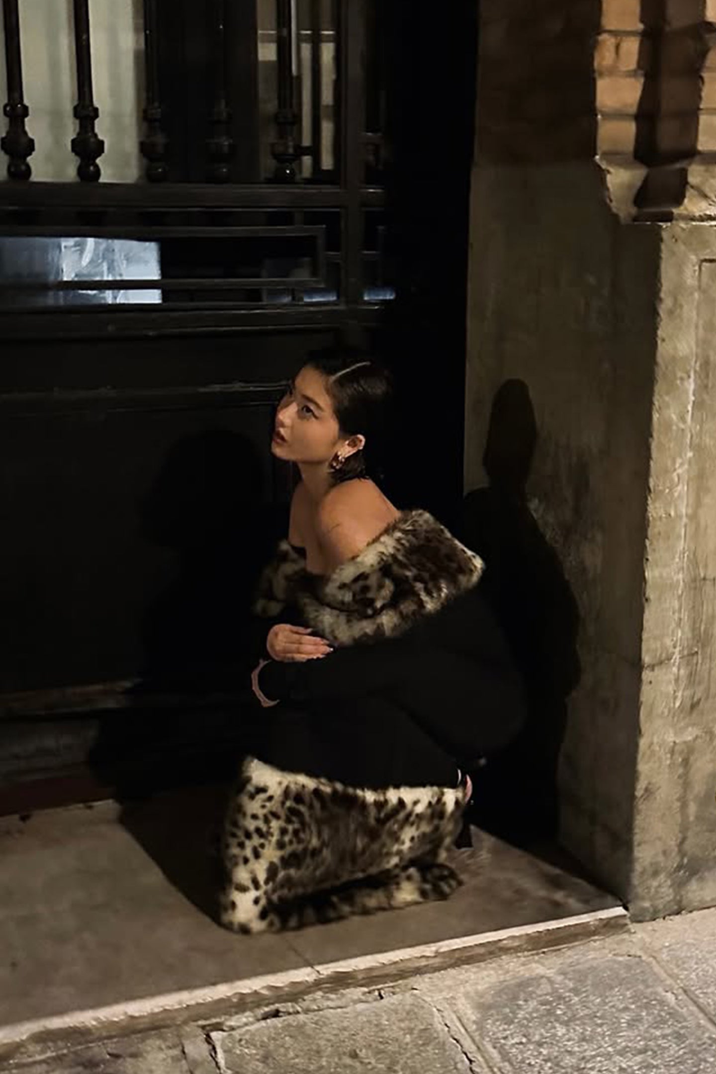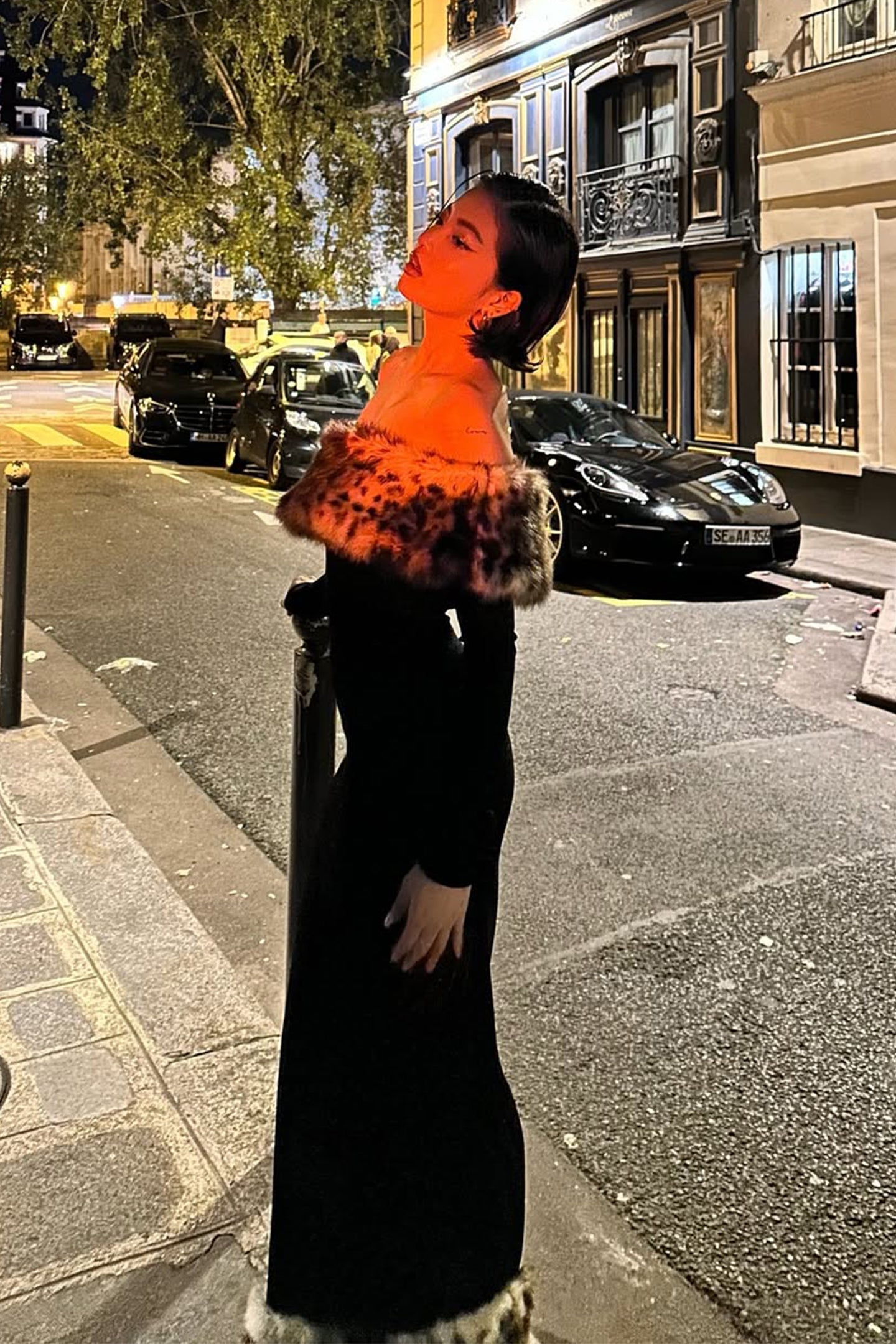 Off Shoulder, Faux Fur Trim Detail, Long Sleeves, Leopard Print, Maxi Length.
