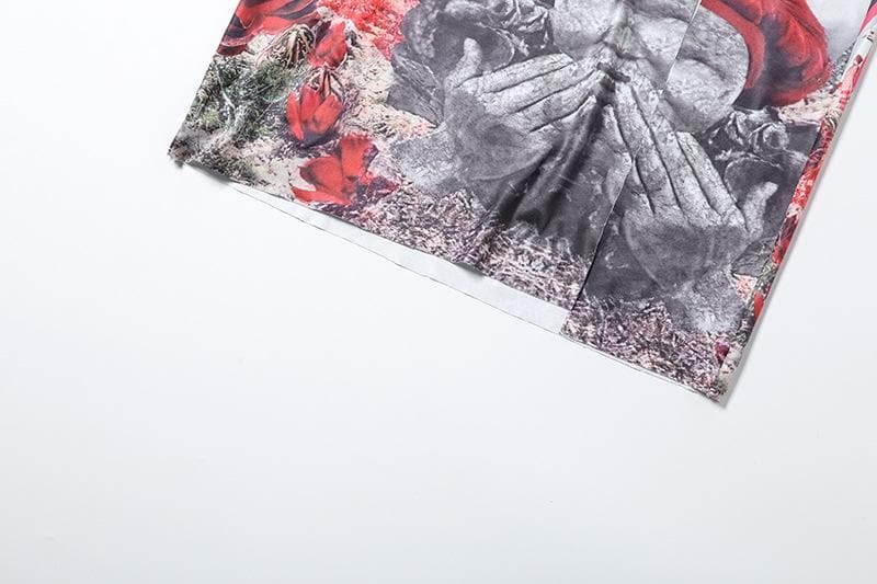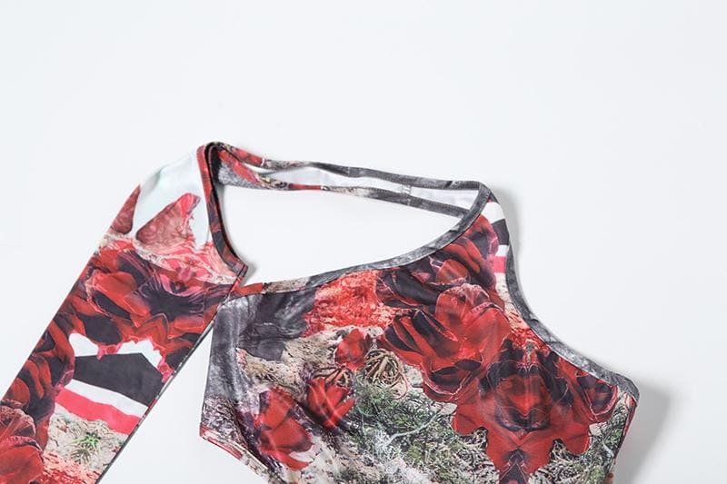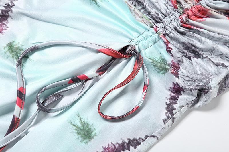 Irregular print contrast drawstring ruched high slit hollow out cut out maxi dress