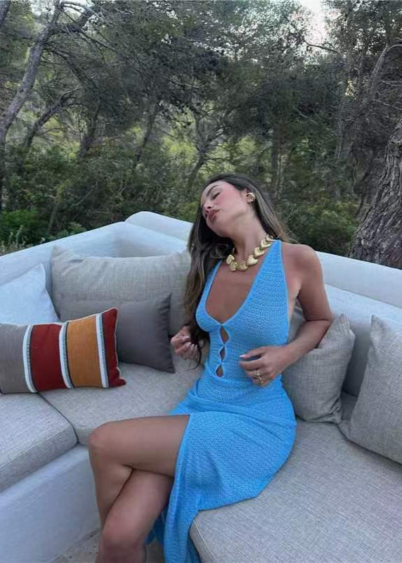 The Isla Crochet Keyhole Maxi Dress is your go-to for beach days, sunset strolls, and summer getaways. Crafted from a breathable stretch-knit fabric, this body-hugging silhouette features a plunging neckline with cut-out keyhole accents and a flattering side slit. The halter-style straps and open back add to its effortlessly bold look.