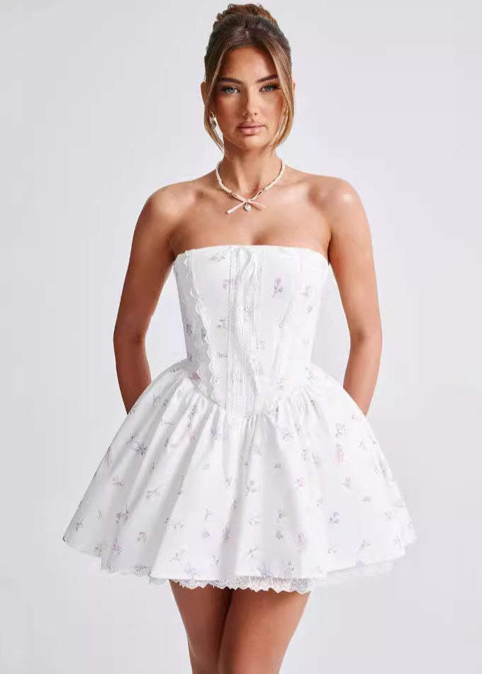 Isla - Strapless Corset Mini Dress is the perfect blend of romance and sophistication. Designed with a structured corset bodice, delicate lace trim, and soft floral details, this dress flatters the silhouette while offering a dreamy, vintage-inspired look. The voluminous skirt adds movement and charm, making it ideal for special occasions, garden parties, or an elegant evening out. A lace-up back ensures a custom fit for added comfort.