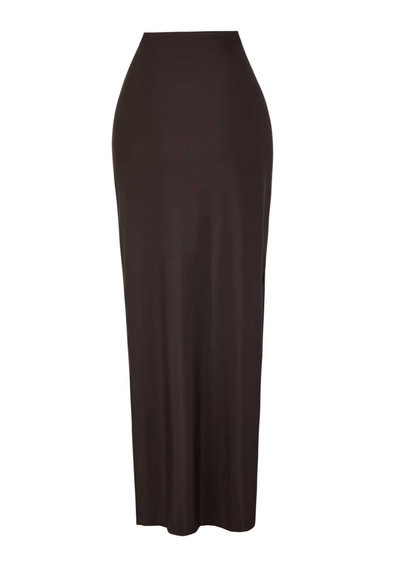 Isla is a head-turning three-piece beachwear set that blends bold design with sleek comfort. The bandeau-style bikini top features a distinctive gold-tone abstract ring at the center and halter neck ties for added support. Matching high-waist bikini bottoms offer moderate coverage and a flattering silhouette. The full-length wrap skirt in the same rich bronze tone is designed with a coordinating hardware accent and side ruching for a cohesive look.