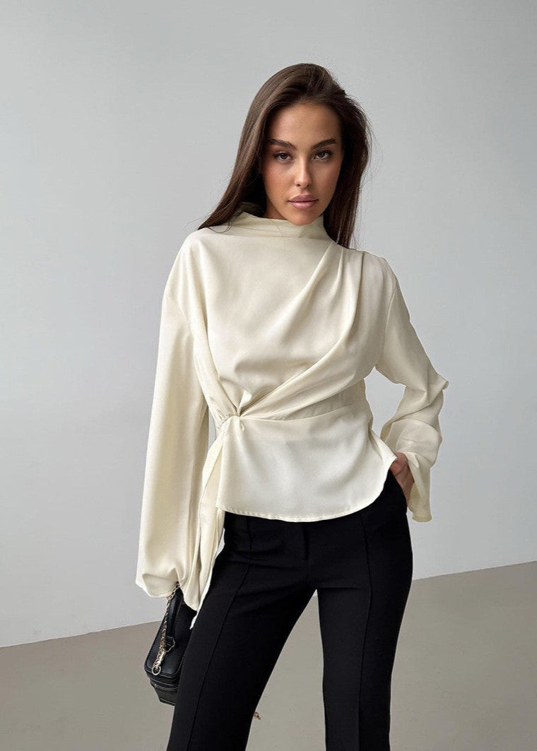 The Ivory Twist-Front Draped Blouse offers a modern silhouette with a sculpted waist detail that creates a flattering drape. Designed in a midweight, non-stretch fabric with a soft matte finish, this long sleeve blouse is ideal for work, events, or an elevated everyday look. The high neckline and relaxed sleeves bring structure and ease, while the asymmetric hem adds interest. Available in sizes S to L with tailored measurements for a comfortable, elegant fit.
