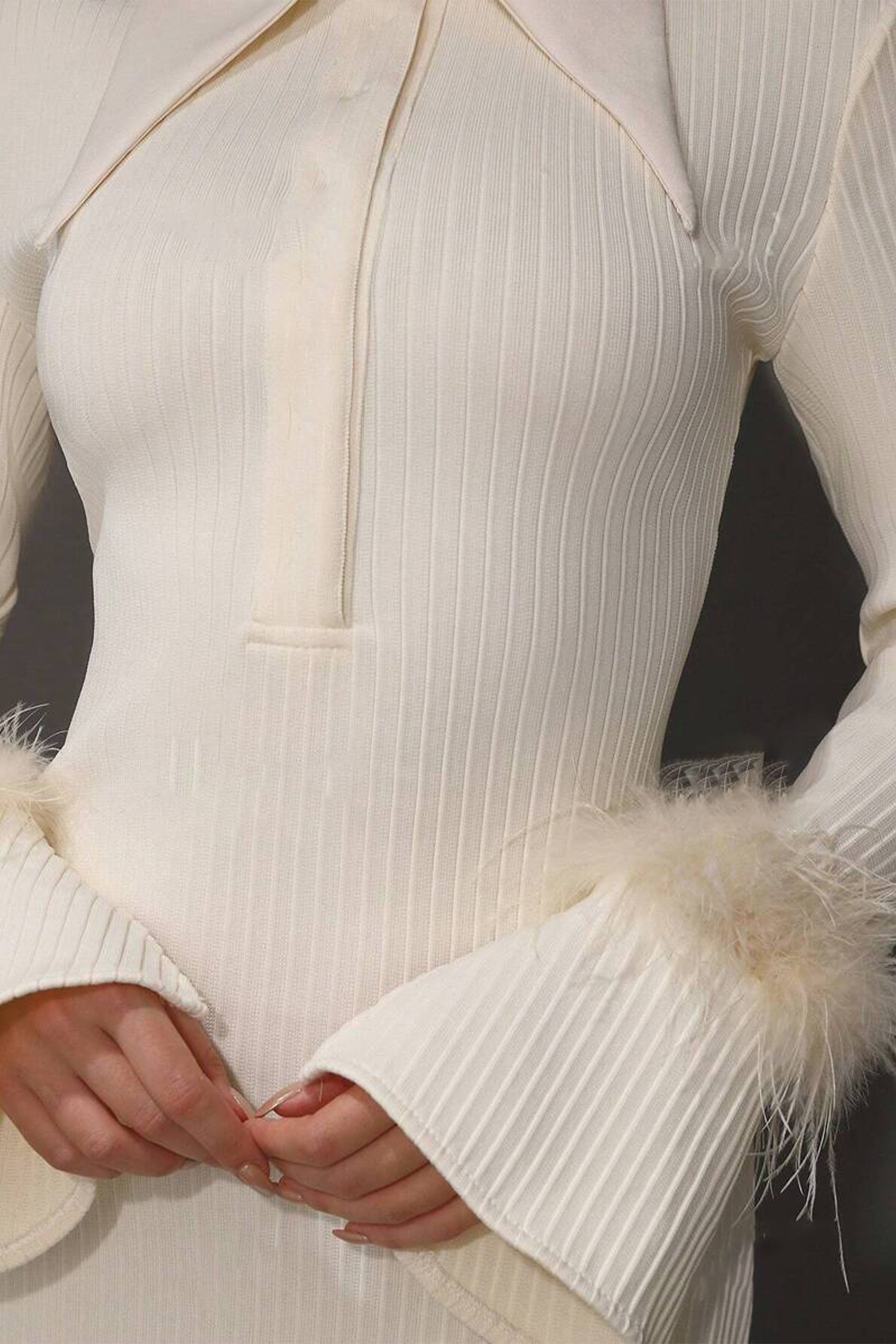 - Knit, long sleeve, solid color, white, feather, midi dress