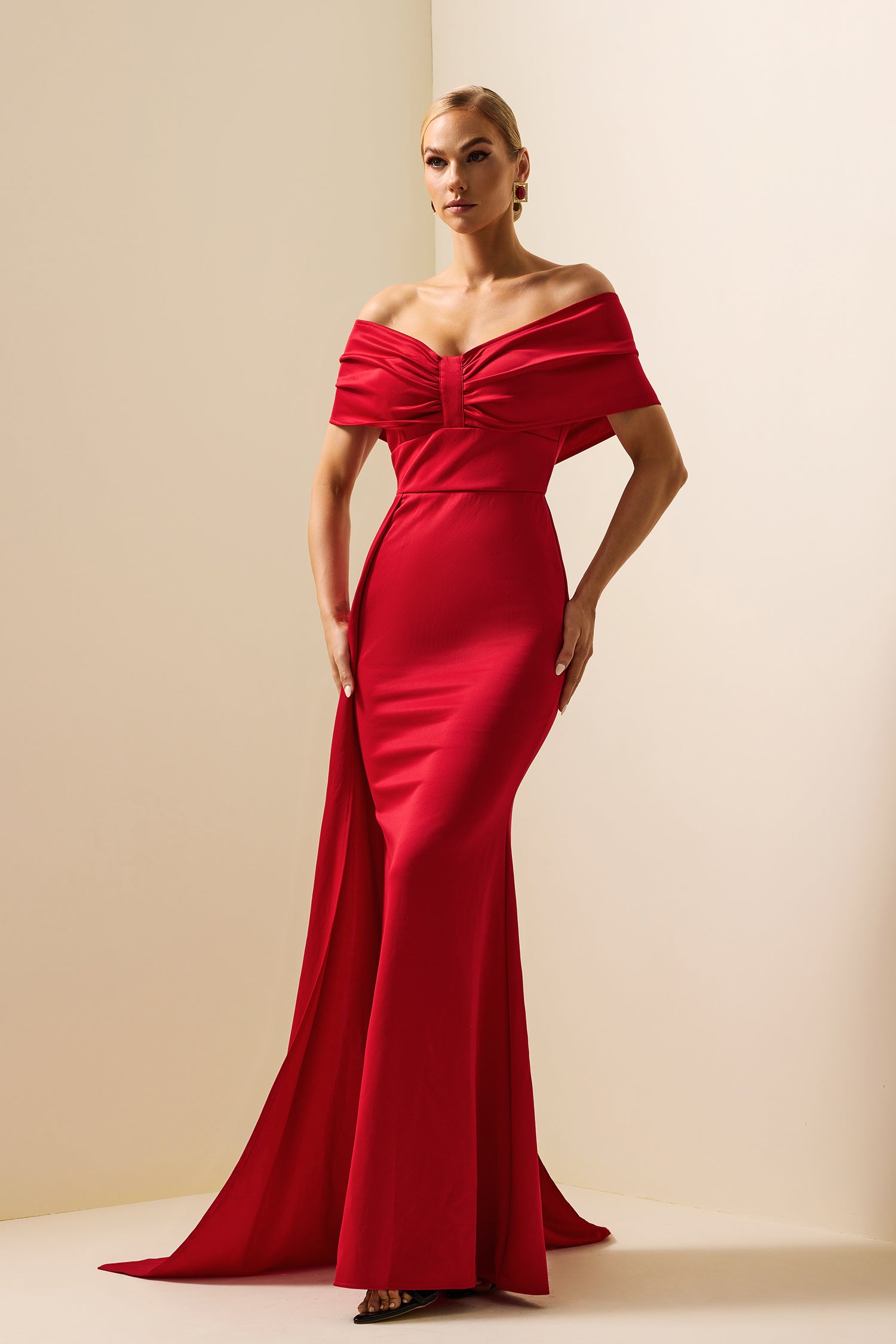 - Jersey, solid color, red, off-shoulder, maxi dress