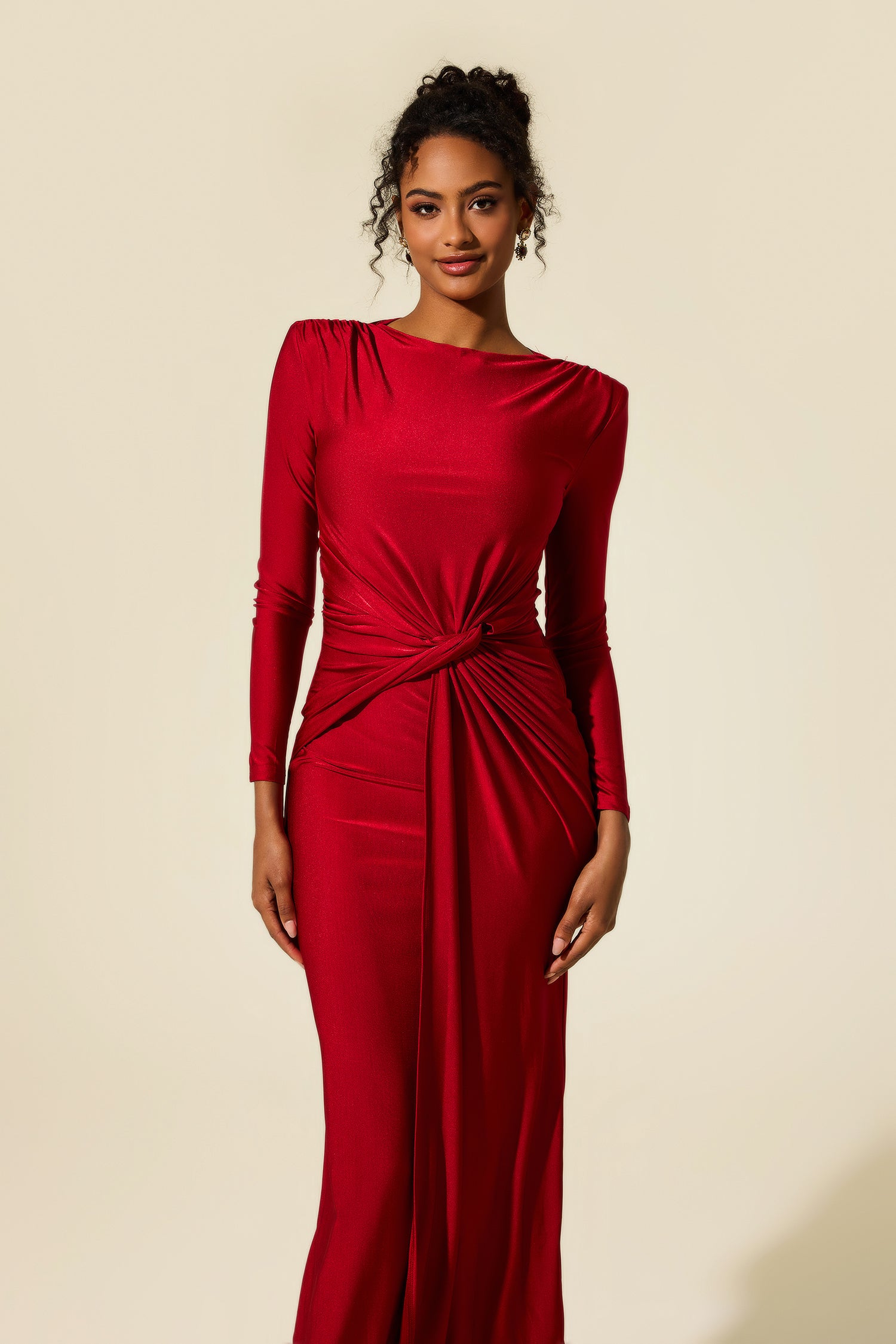 - Solid color, red, jersey, ruched, long sleeve, midi dress