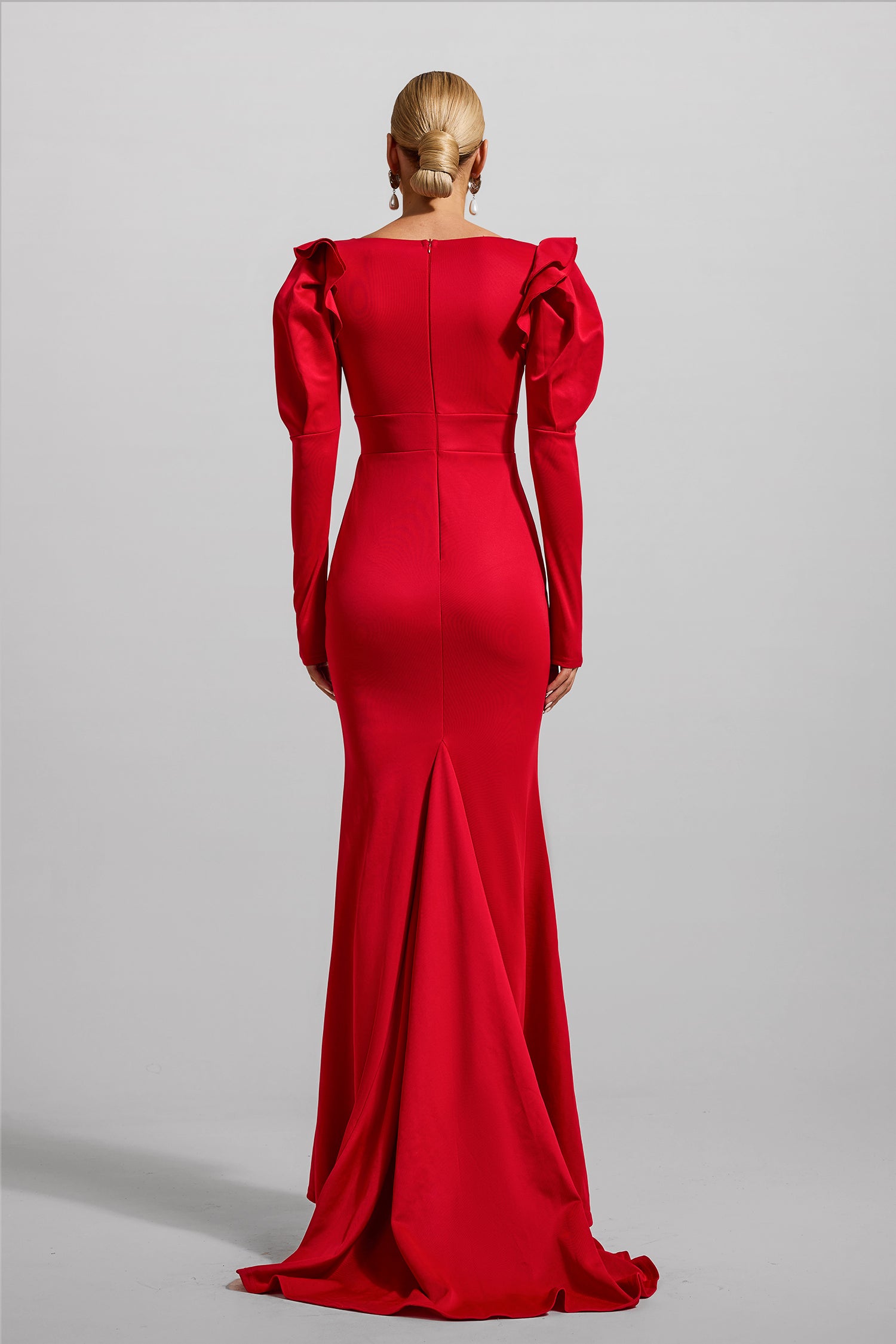 - Jersey, solid color, red, v-neck, frill, maxi dress, long sleeve