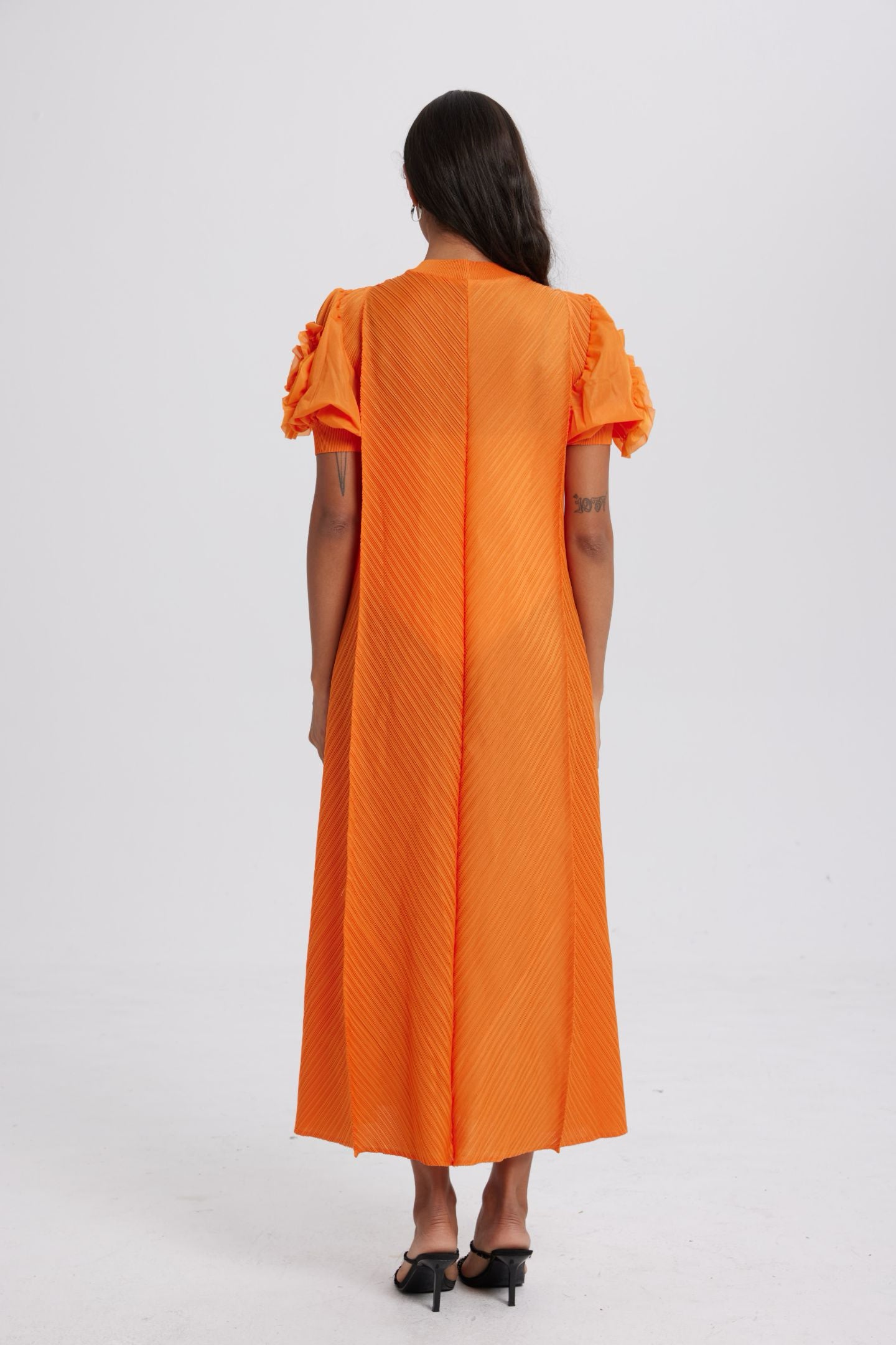 Pleated Fabric, Round Neck, Ruched Detailing, Floral Applique, Puff Sleeves, Midi Length.