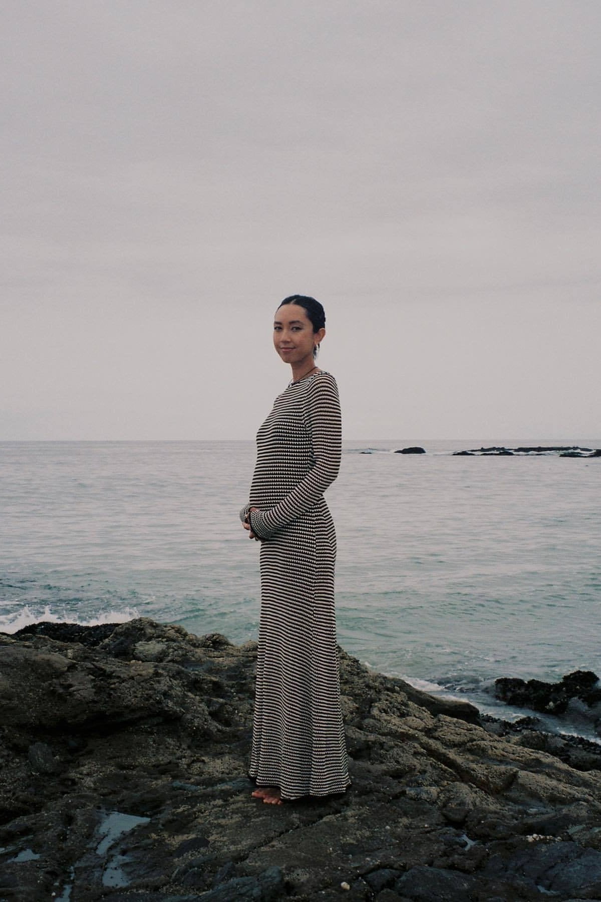 - Skinny Zig Zag Strips, Back Cutout Detail, Flare Long Sleeves, Sheer Effect, Ankle Length.
