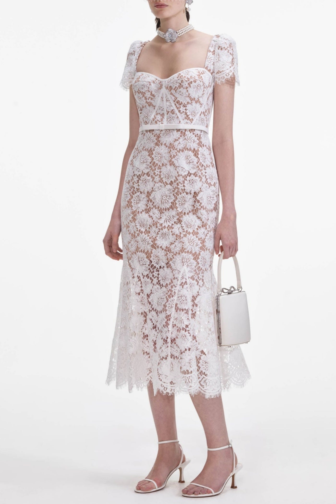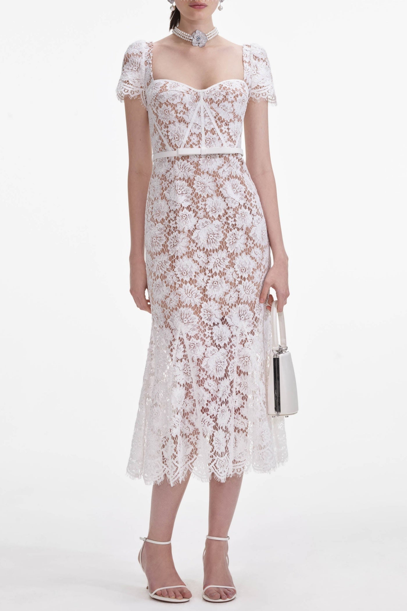Josef Lace Bow Belted Midi Dress - White